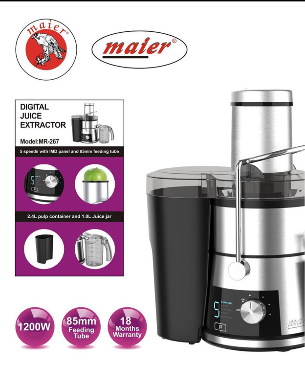 این آبمیوه گیری از توان 1200وات برخوردار است.یکی از ویژگی های خوب آن این است که همه تجهیزات و وسایل این آبمیوه گیر ازهم جدا میشوند و افراد میتوانند آن ها را از هم جدا کرده و هرکدام را جداگانه و با دقت بالایی شستشو دهند. پایه این آبمیوه گیر بدون لرزش و لغزش میباشد و در حین کار با آن هیچ لغزش و لرزشی ایجاد نمیشود.با این آبمیوه گیری شما میتوانید هر نوع میوه چه از نوع کوچک و چه بزرگ را آب گیری کنید.