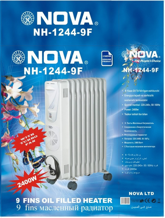 شوفاژ برقی نوا مدل NH-1244 با بهترین قیمت مجهز به سیستم روغنی و دارای 9 پره و توان 2400 وات می تواند محیطی حدود 10 تا 15 متر را به راحتی گرم کند. این محصول را می توان به جرات جزء محبوب ترین وسایل گرمایشی به شمار آورد. گرمایش زود هنگام این محصولات از ویژگیهای منحصر به فردشان به حساب میآید.روغن درون رادیاتور بر اثر گرم شدن درون پره ها شروع به چرخش می کند و سبب گرم شدن فضای اطراف می گردد. دستگاه مجهز به فن و 3 حالت گرمایی و سیستم ترموستات است که دمای دلخواه و مطلوب، با توجه به نیاز و محیط مورد استفاده توسط ولوم روی بدنه دستگاه قابل تنظیم و کنترل است. در صورت لزوم سیستم به طور اتوماتیک خاموش و قطع می شود. چراغ نشانگر دستگاه حالت روشن یا خاموش بودن آن را به شما نیز نمایش می دهد. رادیاتور روغنی نوا برای سهولت در جابجایی و استفاده به صورت چرخ دار ساخته شده و توسط دستگیره روی بدنه به آسانی قابل جابجایی است. همچنین یک محفظه هم برای جمع کردن سیم رادیاتور در پنل جلویی آن طراحی شده است