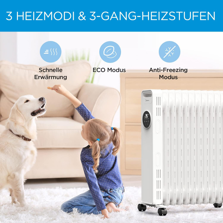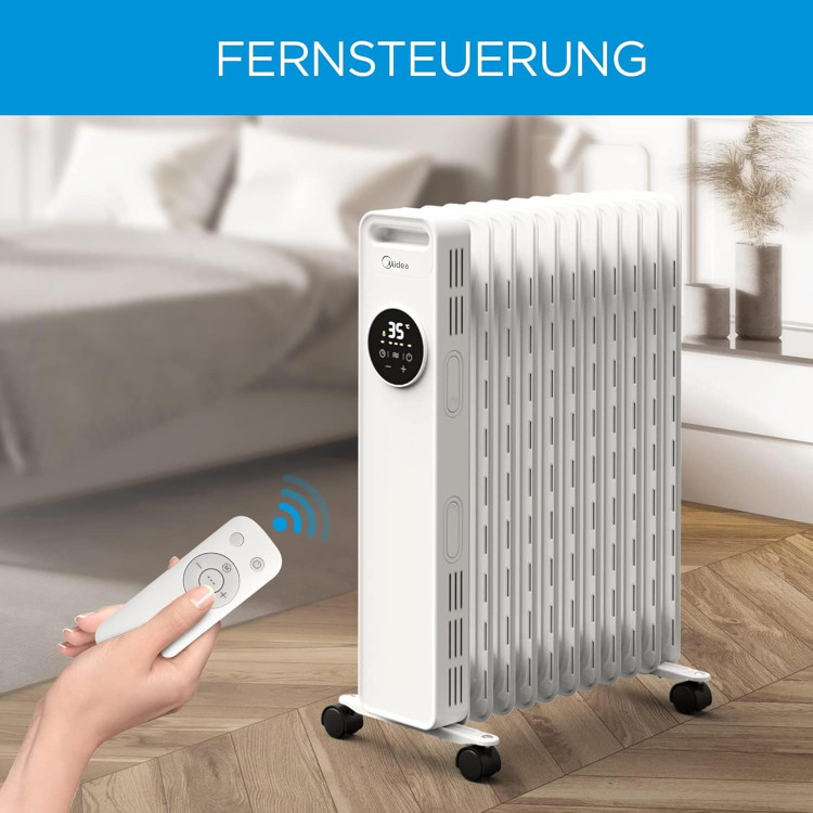 شوفاژ برقی Midea NY2311-20MR با توان 2300 وات، دارای 3 سطح توان و سیستم انتشار حرارت سه بعدی برای گرما از انتها تا انتها. با کنترل از راه دور موجود است.