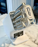 ست چاقو 6 تکه: مجموعه چاقوی آشپزخانه با کیفیت بالا ساخته شده از فولاد ضد زنگ شامل یک چاقوی سرآشپز، چاقوی نان، چاقوی ژامبون، چاقوی کاربردی، چاقوی جداکننده و قیچی، بهعلاوه یک بلوک چاقوی سفید مدرن