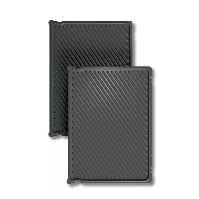 دو صفحه گریل بوش TCG4104 از جنس آلومینیوم دایکاست با پوشش نچسب است. آلومینیوم دایکاست به علت وزن پایین آلیاژ امکان جابجایی هرچه آسانتر را برای شما مقدور میکند. آلیاژ به کار برده شده در این صفحهها به همراه پوشش نچسب، فرآیند پخت و گریل را سرعت بخشیده و همچنین نظافت آن را آسانتر کرده است. صفحههای گریل به صورت مورب طراحی شده است. این صفحهها به گونهای قرار میگیرند که امکان جداسازی روغن و چربی آزاد شده از سطح مواد غذایی ممکن شده است تا غذای شما به صورت کاملا سالم و بهداشتی گریل شود. روغن و چربی اضافی به سمت دو کاسه کوچک نگهداری روغن هدایت میشود.