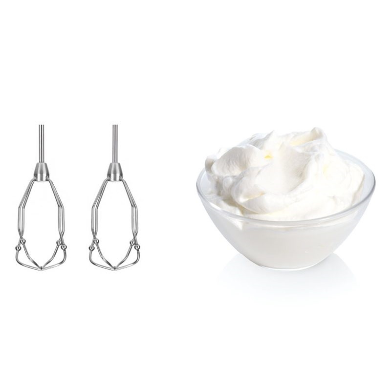 وجود دو میله همزن موسوم به FINE CREAMER از جنس استیل ضدزنگ کار کردن را برای شما آسانتر میکند. این میلهها بهگونهای طراحی شدند تا با استفاده از آن به مواد غذایی خود پف و حجم بسیار بیشتری را بدهید و به پخت ایدهآل مواد غذایی خود برسید. برخورداری از توپهای کوچک تعبیه شده در مکانیزم ساخت این میلهها موجب ایجاد هوای خالی داخل خمیر شده؛ بنابراین ترکیب داری حجم و پف بیشتری خواهد شد. علاوه بر این وجود دو قلاب استیل ضدزنگ بهمنظور سهولت در ورز دادن خمیر نان و پیتزا و ترکیبات چالشبرانگیز بهعنوان دیگر ابزار جانبی در این دستگاه تعبیه شده است. میلههای همزن و خمیرزن را به آسانی میتوان زیر شیر آب تمیز کرد و یا داخل ماشین ظرفشویی گذاشت تا با استفاده از آن قطعات شستشو داده شوند.