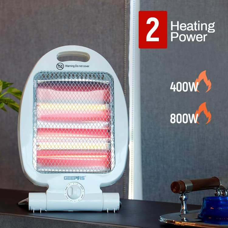 2 تنظیم گرما - بخاری کوارتز 800 واتی Geepas دارای 2 تنظیم حرارت است. 400 وات و 800 وات به سادگی به هر منبع اصلی سوئیچ روشن وصل کنید و صفحه را روی 400 وات یا شماره گیری 800 وات تنظیم کنید. المنت گرمایشی تا تنظیمات دلخواه شما گرم می شود تا دمای هوای اطراف را گرم کند