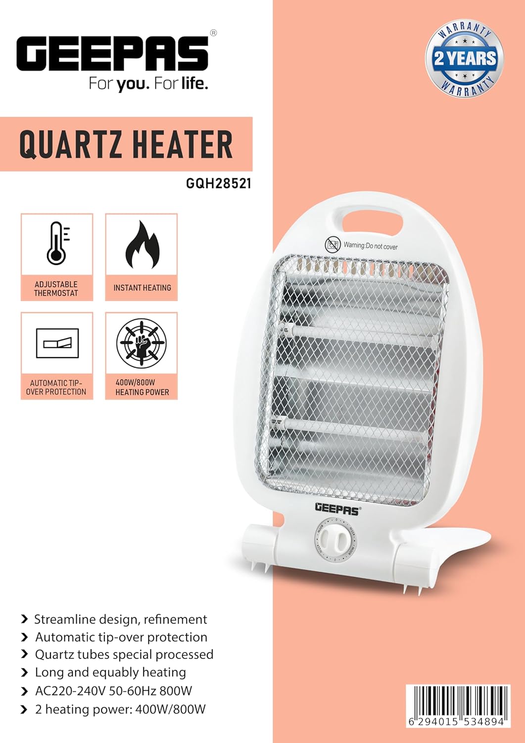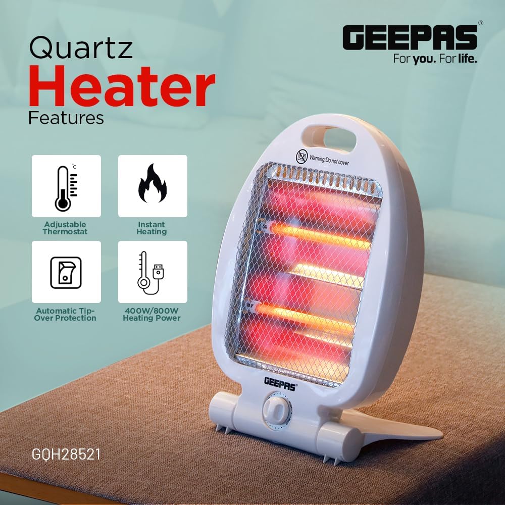 2 تنظیم گرما - بخاری کوارتز 800 واتی Geepas دارای 2 تنظیم حرارت است. 400 وات و 800 وات به سادگی به هر منبع اصلی سوئیچ روشن وصل کنید و صفحه را روی 400 وات یا شماره گیری 800 وات تنظیم کنید. المنت گرمایشی تا تنظیمات دلخواه شما گرم می شود تا دمای هوای اطراف را گرم کند