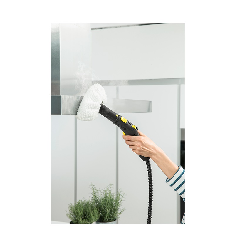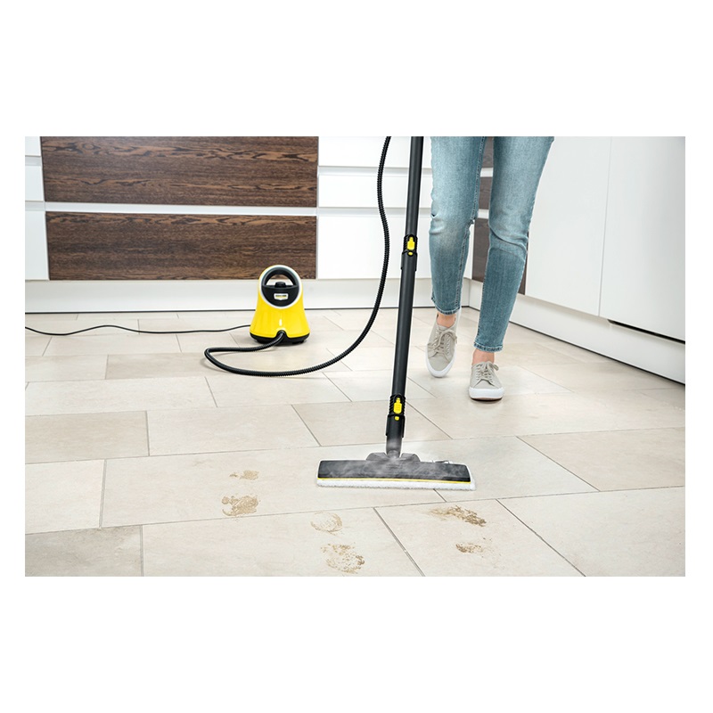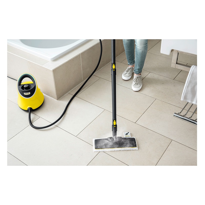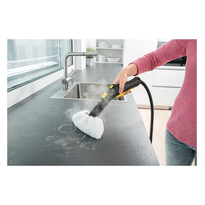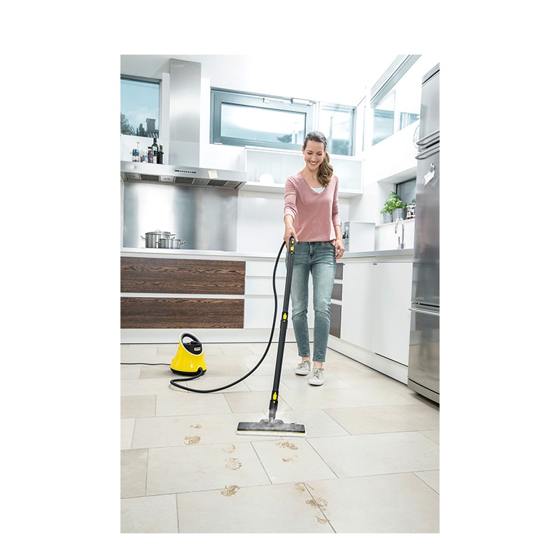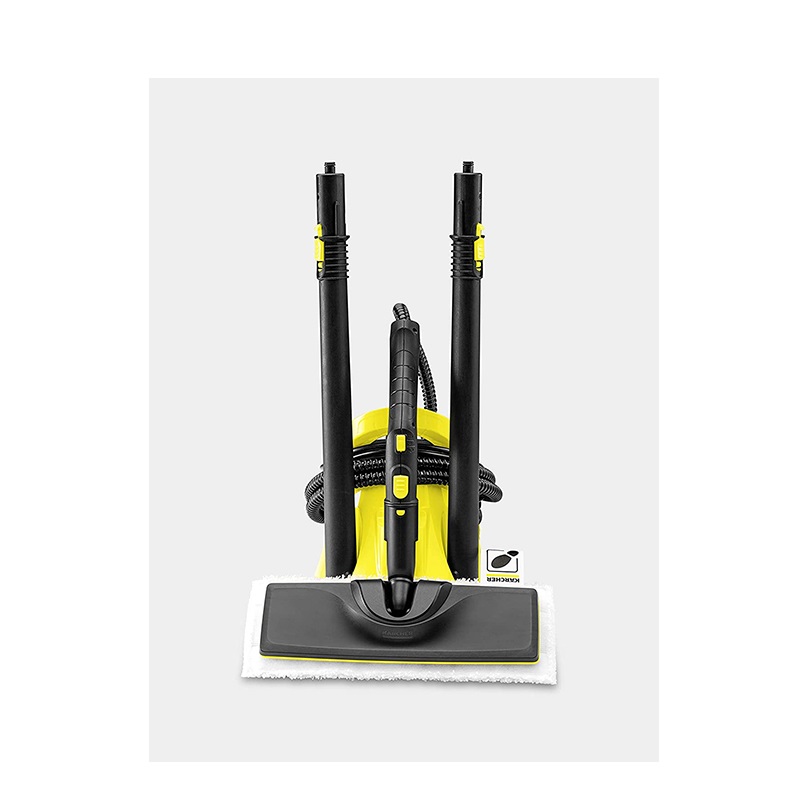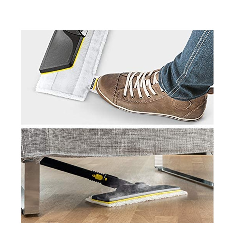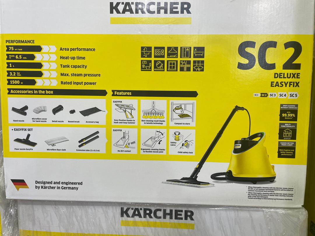 بخارشوی کارچر مدل KARCHER SC2 DELUXE EASYFIX یکی از بهترین سریهای برند کارچر در این زمینه است. نصب و جداسازی آسان اقلام دستگاه و قدرت حرارتی بالا از SC2 یک بخارشوی کاربردی به منظور استفاده برای سطوح و در نتیجه بخارشویی پرطرفدار ساخته است. این بخارشوی دارای توان حرارتی 1500 وات و میزان فشار بخار 3.2 بار قادر به بخار دهی مداوم تا 40 گرم در دقیقه میباشد. همچنین حداکثر حجم بخاردهی این بخارشوی 100 گرم در دقیقه است. مخزن دستگاه دارای ظرفیت 1 لیتری آب است که مدت زمان گرم شدن آب بین 5 تا 6 دقیقه است. با این میزان آب قادر خواهید بود فضایی تا 75 مترمربع را با دقت 99.99 درصد عاری از وجود باکتریهای معمول کنید. طول 2 متری شلنگ بخارشوی کارچر SC2 DELUXE EASYFIX و وجود نازلهای چند منظوره امکان نظافت بخش های مختلف محیط مد نظر شما را مهیا میکند. با نصب سریع و آسان پد و حوله های جانبی بخارشوی قادر خواهید بود به شستشوی کف، کاشی، دستشویی، شیشه و آینه، هود آشپزخانه و انواع شکاف و درزها و قرنیزها بپردازید. 1 حوله میکرو فایبر مخصوص نازل دستی، 1 حوله میکروفایبر مخصوص زمین، 2 لوله 0.5 متری، 1 عدد برس گرد کوچک، 1 عدد پارویی کف Easy Fix، یک نازل دستی، یک نازل شکاف برای دسترسی به مکانهای سخت و کیسه مخصوص نگهداری لوازم جانبی از اقلام همراه بخارشوی KARCHER SC2 DELUXE EASYFIX هستند. حمل بسیار آسان بخارشوی با وزنی کمتر از 3 کیلوگرم، وجود قفل کودک، قفل ایمنی کودک، تنظیم جریان بخار بر روی دسته، طراحی ارگونومیک و منحصربفرد پارویی دستگاه، قابلیت تعویض حوله بدون تماس دست و یا تماس با آلودگی و محلی برای نگهداری نازل کف از دیگر ویژگی های این دستگاه بخارشوی است.