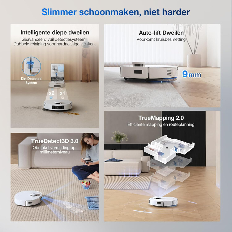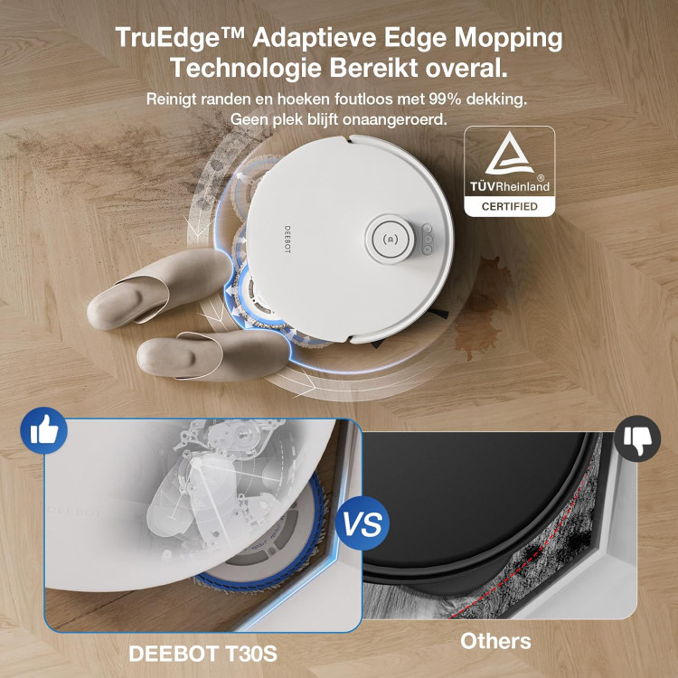 - [تمیز کردن لبه تطبیقی TruEdge] مجهز به فناوری TruEdge، DEEBOT T30S COMBO لبهها و گوشهها را با دقتی بیسابقه تمیز میکند. با استفاده از بازوی توسعه یافته و الگوریتم های پیشرفته، با دقت لبه 1 میلی متری تمیز می شود و به طور قابل توجهی پوشش در مناطق صعب العبور را تا 99 درصد بهبود می بخشد. هیچ لکه ای دست نخورده باقی نمی ماند.