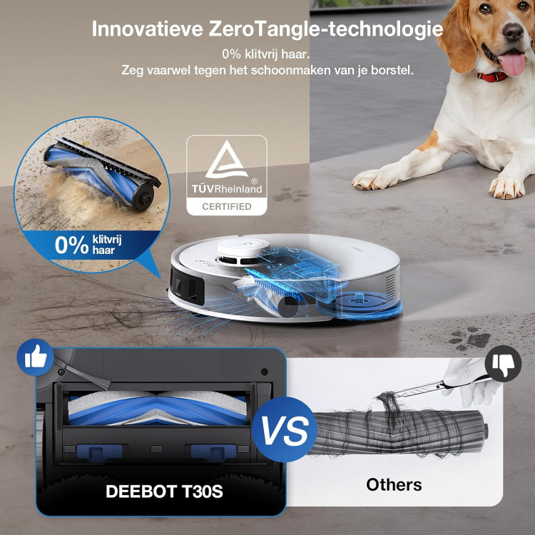 - [ZeroTangle در برابر گره خوردن مو] با گره خوردن و آشفتگی خداحافظی کنید. DEEBOT T30S COMBO که به فناوری ZeroTangle مجهز شده است به طور موثری از گره خوردن موهای انسان و حیوانات در برس اصلی جلوگیری می کند. این امر نگهداری مورد نیاز را به حداقل می رساند و تمیز کردن ملایم، مداوم و کارآمد را تضمین می کند.