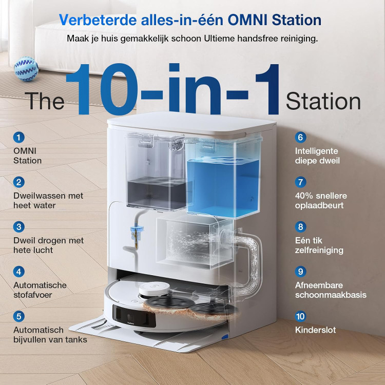 - ایستگاه OMNI All-in-One ارتقا یافته: ایستگاه چند منظوره جدید از شست و شوی شوینده ها با آب داغ 70 درجه سانتی گراد پشتیبانی می کند، به طور خودکار گرد و غبار و آب کثیف را تخلیه می کند. همچنین مسئول خشک کردن موپ ها در هوای گرم است. سیستم جاروبرقی دوگانه به هر دو جاروبرقی اجازه می دهد تا ظروف گرد و غبار خود را در کیسه بزرگ ایستگاه پایه خالی کنند. این ایستگاه OMNI همیشه DEEBOT T30S شما را برای فرآیند تمیز کردن بعدی آماده می کند. راحت و همیشه آماده استفاده.