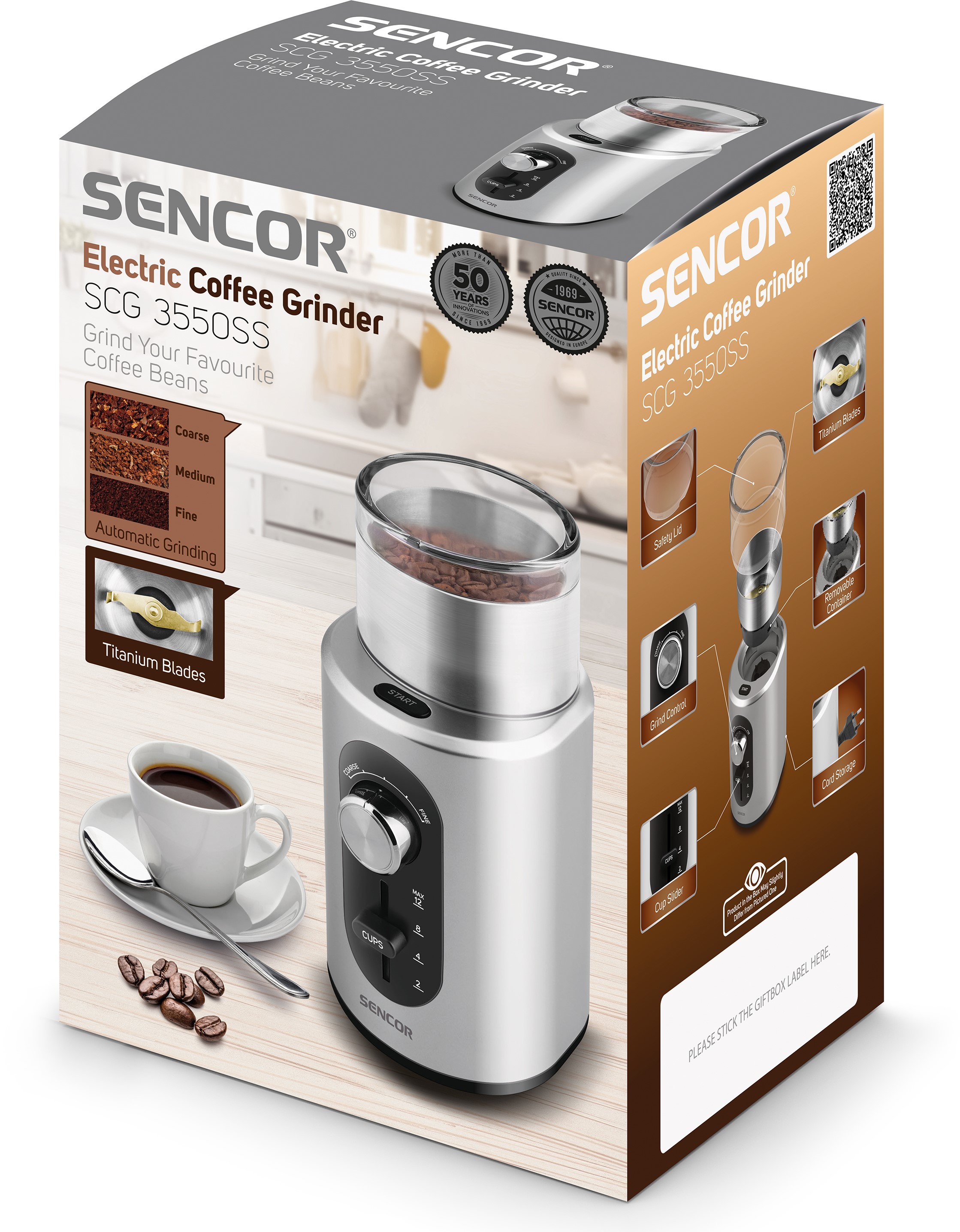 آسیاب سنکور مدل SCG 3550SS محصولی بسیار کارا و خوش ساخت جهت تهیه پودر انواع دانهها با حفظ طعم و عطر اصلی آنها است. طراحی فشرده و جمعوجور این آسیاب موجب شده قراردهی آن بر روی هربخش آشپزخانه به آسانی امکانپذیر باشد. همچنین کابل برق دستگاه نیز درون محفظه تعبیه شده آن قابلیت ذخیرهسازی را دارد تا نظم محیط قرارگیری آن همواره حفظ شده و از ایجاد آسیب بر روی سیم نیز جلوگیری شود.علاوه بر این طراحی شکیل این آسیاب دیگر ویژگی ظاهری آن محسوب میشود. استفاده از روکش کروم روی کنترلکننده چرخشی و بزرگ تعبیه شده بر روی بدنه دستگاه علاوه بر جلوه ظاهری، امکان استفادهای ارگونومیک و آسان را برای کاربر فراهم کرده است. بکارگیری پایههای ضدلغزش از ایجاد حرکت احتمالی در هنگام انجام فرایند جلوگیری میکند. نکته ویژه این آسیاب برخورداری آن از طول عمر بالای آن ست. استفاده از متریال استیل ضدزنگ در ساخت مخزن داخلی به ظرفیت 60 گرم، موجب ایجاد دوام بالای آسیاب شده و همچنین در صورت نیاز، تعمیر و نگهداری دستگاه را آسان میکند. تیغه دوپره آسیاب نیز از متریال استیل ضدزنگ با روکش تیتانیوم ساخته شده است. این امر سبب میشود که آسیاب دانههای مورد نظر به طور یکنواخت و با حفظ عطر و طعم اصلی به انجام برسد. به کمک کنترل کننده چرخشی این محصول میزان آسیاب دانههای قهوه را تنظیم خواهید کرد تا پودر دلخواه برای تهیه نوشیدنی مختص به آن تهیه شود. همچنین از طریق کنترل کننده اهرمی نیز مقدار قهوه در مقیاس تعداد فنجان در بین بازه 2 تا 12 عدد فنجان قابل تنظیم خواهد بود. علاوه بر دانههای قهوه، دستگاه قادر به آسیاب انواع دانهها اعم از دانه هل، چوب دارچین، بذر گشنیز، دانه زیره، فلفل سیاه، فلفل قرمز، زعفران، نعناع خشک شده، دانه آفتابگردان، گردو و بادام نیز است. مکانیزم قفل ایمنی تعبیه شده در آسیاب سنکور مدل SCG 3550SS از شروع ناگهانی فرایند دستگاه و خطرات احتمالی آن جلوگیری میکند؛ به این ترتیب که تا قرارگیری صحیح و کامل تمامی قطعات، فرایند دستگاه آغاز نخواهد شد. پس از هربار انجام فرایند، نظافت و شستشوی قطعات آسیاب بر طبق دفترچه راهنمای مختص محصول، در ماشین ظرفشویی امکانپذیر خواهد بود.