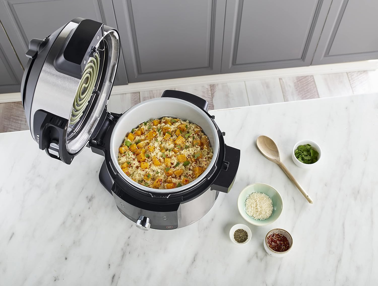 مولتی کوکر نینجا مدل OL650 نسل جدید از لوازم پخت و پز این برند معتبر است که شما را در انجام امور متنوع آشپزی همراهی میکند. این دستگاه قدرتمند با توان ۱۷۶۰ وات ۳ فرایند اصلی پخت یعنی زودپز، بخارپز و آرامپز را بهبهترین شکل بهانجام میرساند. علاوه بر این، ۱۴ برنامه شامل ۴ روش پخت ترکیبی با بخارپز، زودپز با امکان انتخاب نوع تخلیه بخار، سرخ کردن، گریل، پختن، خشک کردن مواد غذایی، ساخت خمیر، تفت دادن، بخارپز کردن، آرام پز و تهیه ماست دیگر عملکردهای این محصول را تشکیل میدهند. فرایندهای اصلی ذکر شده با حرکت دادن دکمه اسلایدر روی دستگاه انتخاب شده و پس از آن عملکردهای دستهبندی مربوط به آن نیز با استفاده از کنترلکننده چرخشی و دکمههای لمسی قابل اعمال خواهند بود. به ادعای کمپانی نینجا دیگر امتیاز ارزشمند این دستگاه سرعت بالا در انجام عملکردهای متنوع آشپزی است. به گفته این شرکت بهکمک فرایند آشپزی با بخار این مولتی کوکر در مدت کمتر از ۶۰ دقیقه قادر به پخت یک مرغ بریان کامل خواهید بود یا از طریق انتخاب سایر عملکردها ظرف مدت کمتر از ۳۰ دقیقه وعده غذایی خانوادگی موردنظر خود را آماده خواهید کرد. از طریق انتخاب برنامه زودپز این محصول، تا میزان ۷۰ درصد سریعتر به نسبت روشهای سنتی پخت به نتیجه دلخواه خود دست پیدا میکنید. سیستم گردش هوای داغ درست شبیه به مکانیزم یک دستگاه سرخ کن در این مولتی کوکر نیز تعبیه شده است. از همین بابت فرایند سرخ کردن مواد غذیی نیز با مصرف کمترین میزان روغن و بهگونهای کاملا سلامت قابل انجام خواهد بود. مخزن پخت این مولتی کوکر با دارا بودن ظرفیت ۷.۵ لیتری حجم مناسبی از مواد غذایی را در خود جای میدهد. این ظرفیت معادل تهیه وعده غذایی برای جمع ۶ نفره است. متریال ساخت کاسه پخت از سرامیک نانو بوده که ضمن حفظ اصالت طعم مواد غذایی، شستشوی آسان و بدون دردسر را نیز موجب میشود. علاوه بر این کاسه دیگر اقلام جانبی دستگاه شامل پایه مخصوص بخارپز کردن مواد غذایی، پایه نگهدارنده سبد سوخاری و سبد مخصوص سوخاری کردن میشود. گفتنی است امکان شستشوی قطعات جانبی دستگاه در ماشین ظرفشویی وجود دارد.