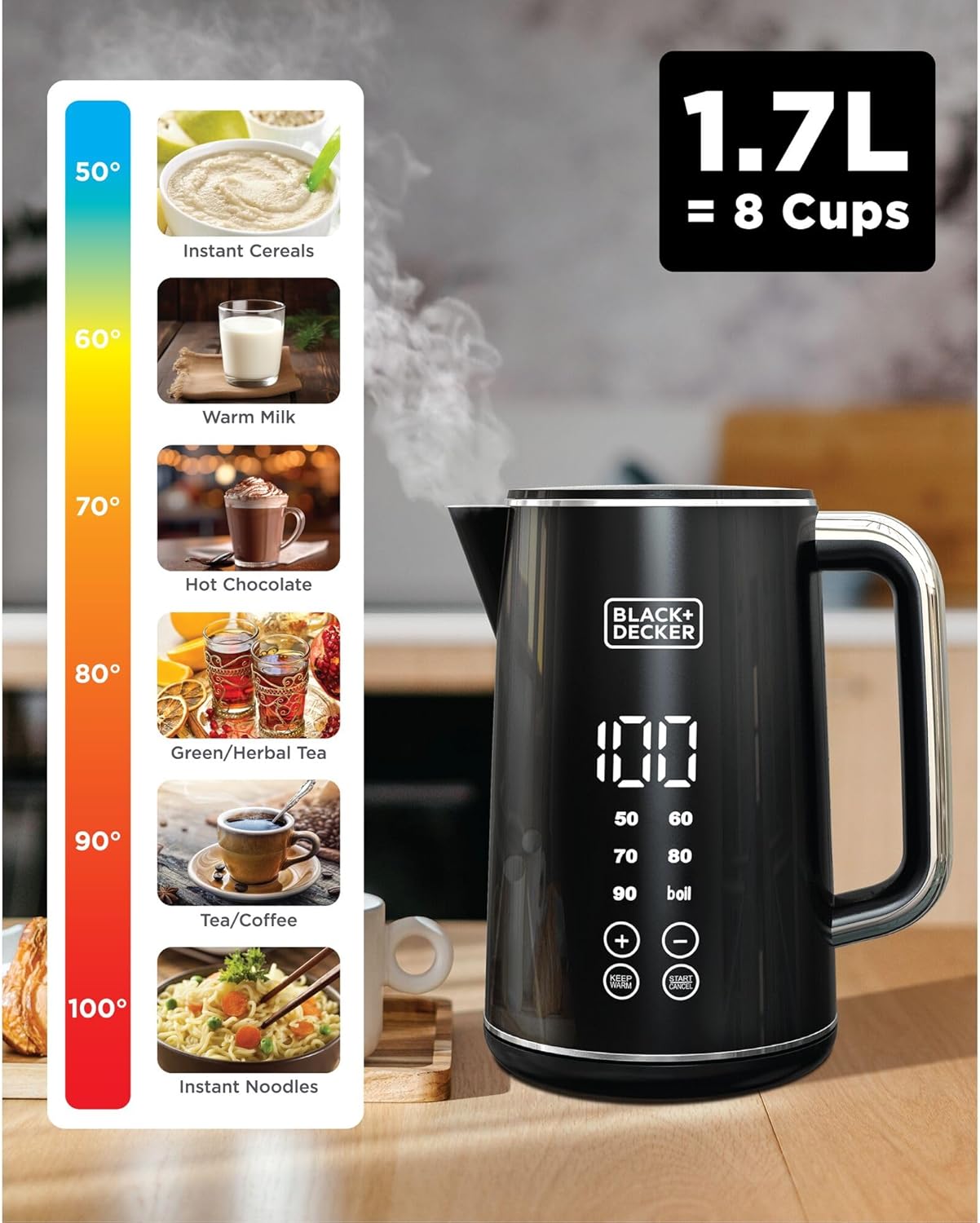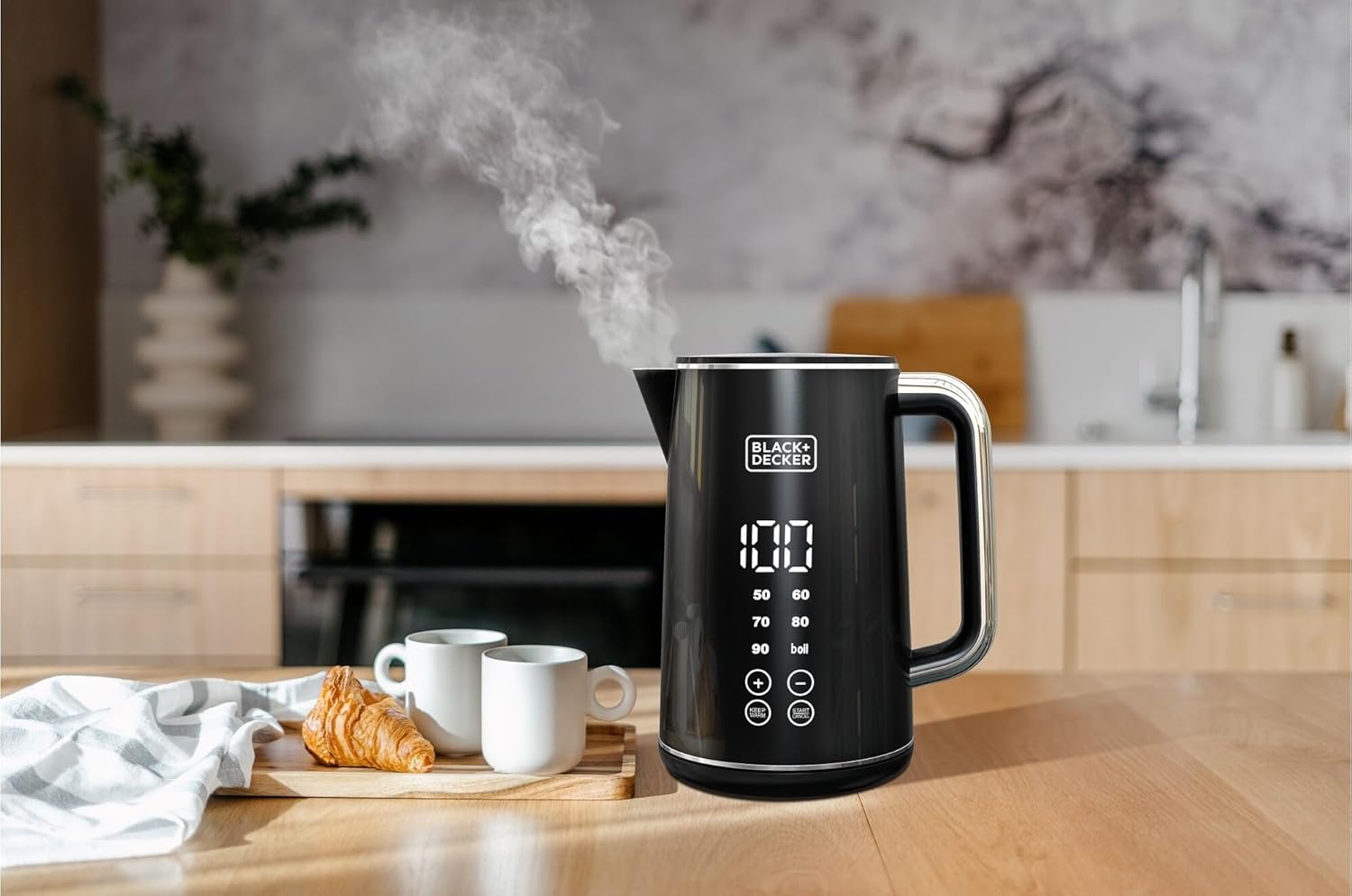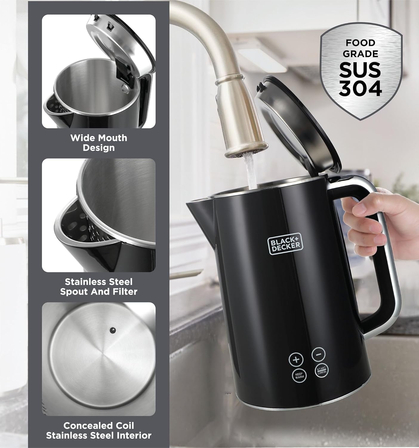 مشخصات فنی برند: بلک اند دکر نوع: کتری برقی توان مصرفی: 2200 وات ظرفیت: 1.7 لیتر جنس بدنه: استیل ضد زنگ قابلیت چرخش: 360 درجه روی پایه سیستم ایمنی: قطع خودکار پس از جوش آمدن نشانگر میزان آب: بله طراحی: شیک و مدرن سایر ویژگیها: فیلتر ضد رسوب، پایه ضد لغزش، مناسب برای استفاده روزمره. توان مصرفی 2200 وات: با این توان، کتری JCD200 میتواند آب را در سریعترین زمان ممکن به جوش بیاورد. ظرفیت 1.7 لیتر: ظرفیت مناسب برای تهیه آب جوش برای خانوادهها یا مهمانیها. بدنه استیل ضد زنگ: طراحی محکم و مقاوم در برابر زنگ زدگی و خش، که علاوه بر کارایی، زیبایی خاصی به کتری میبخشد. فیلتر ضد رسوب: فیلتر موجود به شما کمک میکند تا از آب جوش تمیز و بدون رسوب بهرهمند شوید. سیستم خاموشی خودکار: این سیستم ایمنی کتری را پس از جوش آمدن آب بهطور خودکار خاموش میکند، که باعث افزایش ایمنی میشود. پایه چرخشی 360 درجه: این ویژگی امکان قرار دادن کتری را از هر زاویهای فراهم میکند و کار با آن را آسانتر میسازد. سرعت بالا در جوشاندن آب: با توان 2200 وات، آب شما در کمترین زمان ممکن به جوش میآید. ظرفیت مناسب: 1.7 لیتر آب برای خانوادهها یا مهمانیها کافی است و میتوانید به راحتی برای نوشیدنیهای مختلف آب جوش کنید. ایمنی بالا: سیستم خاموشی خودکار خیال شما را از بابت ایمنی راحت میکند و خطرات ناشی از جوش آمدن بیش از حد آب را کاهش میدهد. طراحی زیبا و مدرن: بدنه استیل و طراحی شیک این کتری جلوهای زیبا به آشپزخانه شما میبخشد. فیلتر قابل شستشو: با وجود فیلتر ضد رسوب، شما همیشه آب جوش تمیز و بدون ناخالصی خواهید داشت. استفاده آسان: طراحی ارگونومیک و پایه چرخشی 360 درجه، استفاده از کتری را برای همه افراد آسان میکند. تهیه چای و قهوه: با این کتری میتوانید به راحتی آب جوش برای تهیه انواع نوشیدنیهای گرم را فراهم کنید. پختوپز: این کتری میتواند به شما در تهیه غذاهایی که نیاز به آب جوش دارند، کمک کند. استفاده در محل کار: در محیطهای اداری نیز میتوانید از این کتری برای تهیه نوشیدنیهای گرم استفاده کنید. مسافرت و کمپینگ: طراحی سبک و جمعوجور این کتری، آن را به گزینهای عالی برای سفرها و کمپینگ تبدیل میکند.