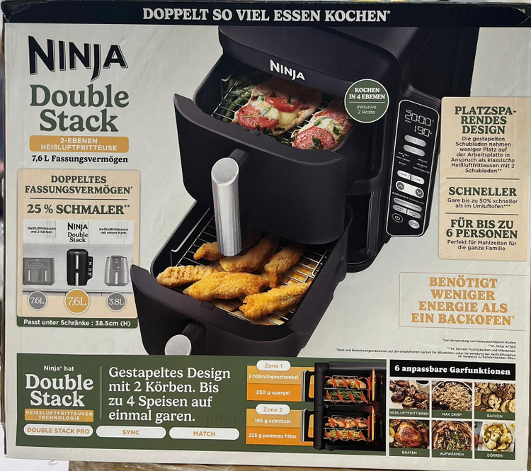 شامل: سرخ کن بادی 7.6 لیتری Ninja Double Stack (شاخه بریتانیا)، 2 کشو 3.8 لیتری، 2 عدد بشقاب کریسپر نچسب، 2 قفسه. قطعات قابل شستشو در ماشین ظرفشویی. ابعاد: H38.5cm x W28cm x D42cm. وزن: 9.76 کیلوگرم. رنگ: خاکستری