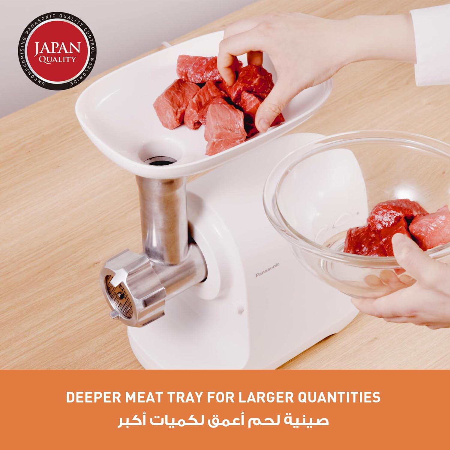 گوشت پاناسونیک مدل MK-GX1700 طراحی ساده اما شکیلی دارد و رنگ سفید و زیبای آن نظر هر سخت پسندی را به خود جلب می کند. با کمک این چرخ گوشت می توانید به یکباره مقدار زیادی گوشت را چرخ کنید. به لطف شکل عمیق تر، گوشت به راحتی در سینی قرار می گیرد. افزایش حجم سینی به شما این امکان را می دهد که در هر زمان گوشت بیشتری را روی سینی قرار داده و سپس توسط اهرم دستی به داخل لوله و تیغه ها جهت خرد شدن هدایت کنید.