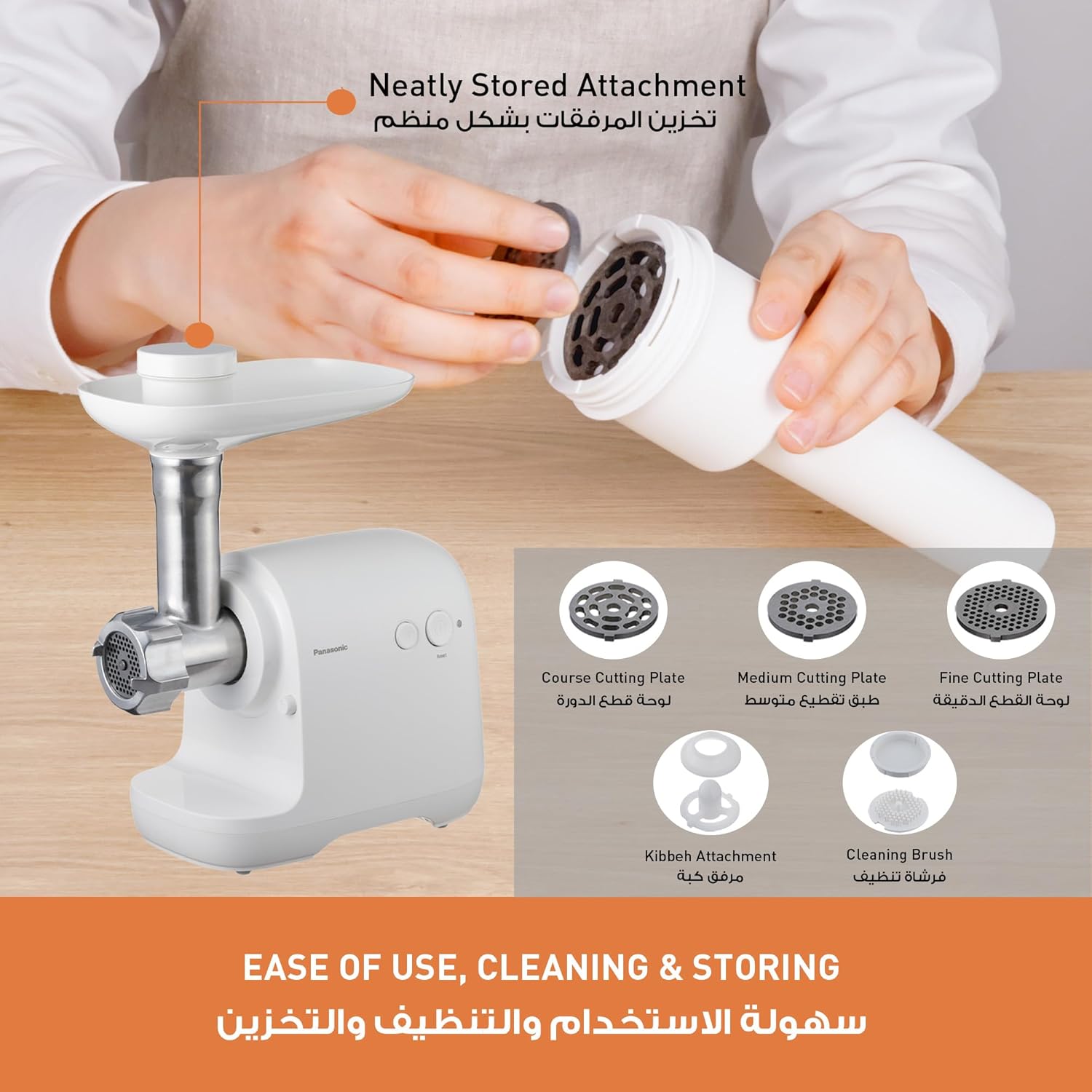 پیوست ها یا ضمائم این چرخ گوشت Panasonic را جهت ذخیره سازی منظم می توان به طور فشرده در داخل هل دهنده غذا یا اهرم دستی نگهداری کرد. پیوست ها را می توان همراه با واحد اصلی نیز ذخیره کرد، بنابراین لازم نیست نگران مکان نگهداری آنها باشید.