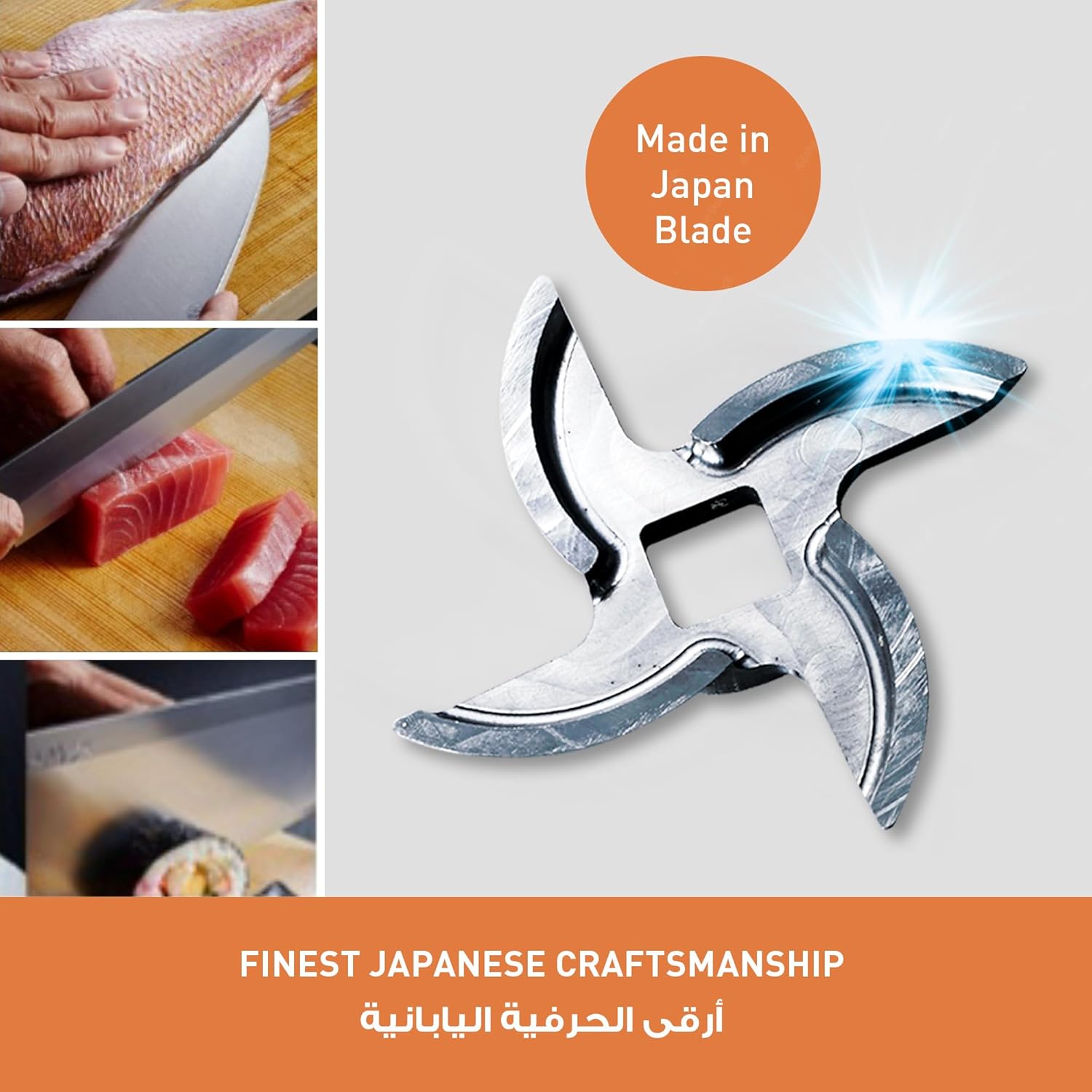 تیغه ای که برای خرد کردن دقیق گوشت طراحی شده به صورت 4 پره است. لبه های منحنی تیغه به شما امکان می دهد یک برش تمیز و مرتب ایجاد کنید، زیرا تیزترین قسمت تیغه در فرآیند خرد کردن استفاده می شود. علاوه بر این، تیغه ها مانند شمشیرهای سنتی ژاپنی کمی محدب هستند که به برش بهتر گوشت کمک می کند.