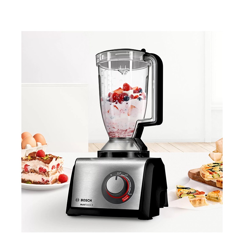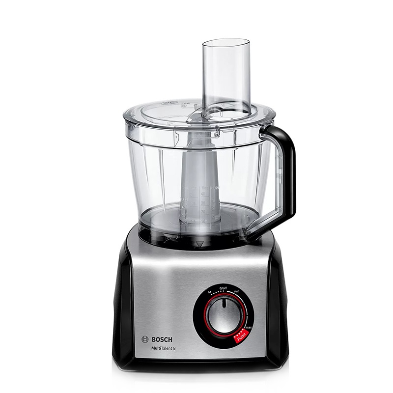 شرکت بوش با طراحی غذاساز MC812M853G شما را از سایر محصولات آشپزخانه بینیاز کرده و پاسخگوی بسیاری از نیازهای آشپزی شما خواهد بود. سری MULTI TALENT 8 یکی از کاملترین مدلهای غذاساز موجود در دنیا است. تقریبا هیچکاری برای این دستگاه غیر ممکن نیست؛ در این سری بیش از 50 عملکرد متنوع برای برش دادن سبزیجات، آماده کردن خمیر، خرد کردن گیاهان معطر و خشک، مخلوط کردن میوه، رنده کردن پنیر، هم زدن خامه، ترکیب سوپ، خرد کردن یخ و …. تعبیه شده است. همه ما دوست داریم با کمترین زحمت برای درست کردن وعدههای غذایی روزانه خود از مواد اولیه تازه استفاده کنیم. بهوسیله خردکن این محصول تهیه مواد اولیه به صورت تازه برای مصارف روزمره امکانپذیر شده است. اسموتی و لیموناد تنها زمانی خوشمزه است که تازه درست شده باشد. با استفاده از لوازم جانبی برای آبگیری مرکبات، توانایی تهیه آبمیوه تازه و خوشمزه را خواهید داشت. برای درست کردن اسموتی بهصورت روزانه دیگر نیاز به زحمتهای معمول نخواهد بود و به آسانی با پارچ مخصوص 1 لیتری، برای خود و دیگران یک اسموتی تازه و دلنشین درست کنید. بعد از استفاده از پارچ برای نظافت تنها کافی است که آن را داخل ماشین ظرفشویی گذاشته تا شسته شود. از آنجایی که در حال حاضر یکی از جدیدترین و کاملترین غذاسازهای بوش در بازار است، قیمت غذاساز بوش مدل سری مولتی تلنت ۸ از سایر مدلهای پیشین خود بالاتر است.