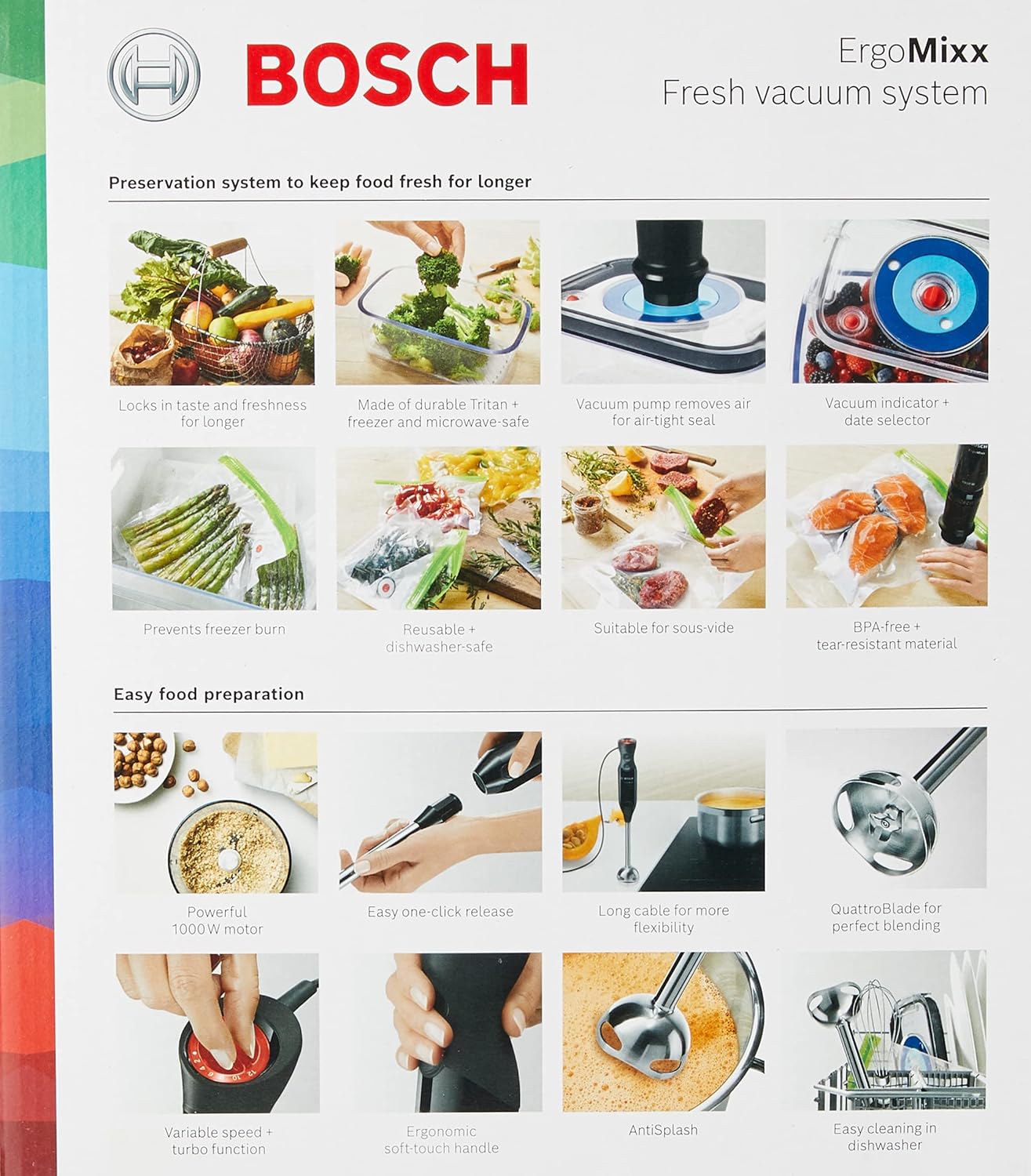غذای خود را برای مدت طولانی تری تازه نگه دارید. پمپ خلاء را با یک کلیک ساده به مخلوط کن دستی خود وصل کنید و غذای تازه، باقی مانده یا تنقلات را در ظروف وکیوم و کیسه های زیپ دار نگهداری کنید. هر روز از طعم غذای تازه لذت ببرید. ظرف بادوام و کیسه های زیپی مقاوم در برابر پارگی، قابل استفاده مجدد هستند. کیسه های زیپی و ظروف در مایکروویو قابل استفاده و در ماشین ظرفشویی به راحتی شسته و تمیز می شوند.