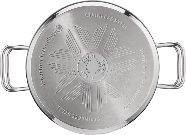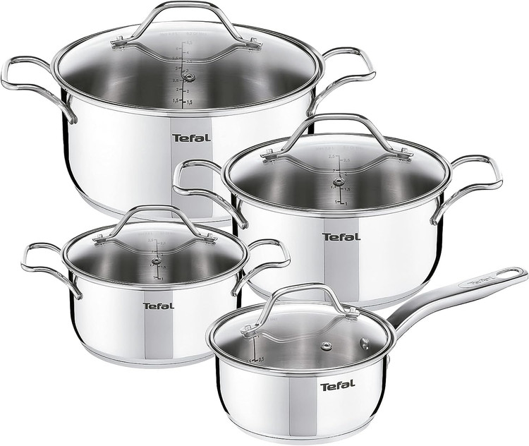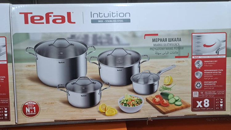 سرویس قابلمه Intuition مدل B864S874 تفال یک مجموعه 8 پارچه شامل 4 عدد قابلمه سایز 16 ، 20 ، 24 و 28 سانتی متر و 4 عدد درب شیشه ایست. قابلمه های این ست از جنس استیل ضدزنگ ساخته شده اند و کیفیت ساخت و دوام بسیار بالایی دارند و مناسب برای استفاده روزمره هستند. درب قابلمه ها از جنس شیشه بوده و به همین دلیل برای سرزدن به غذا نیازی به برداشتن آن ها نیست. همچنین به دلیل استفاده از درجه بندی درون ظروف می توانید آن ها را دقیقا به همان اندازه ای که نیاز است پر کنید.