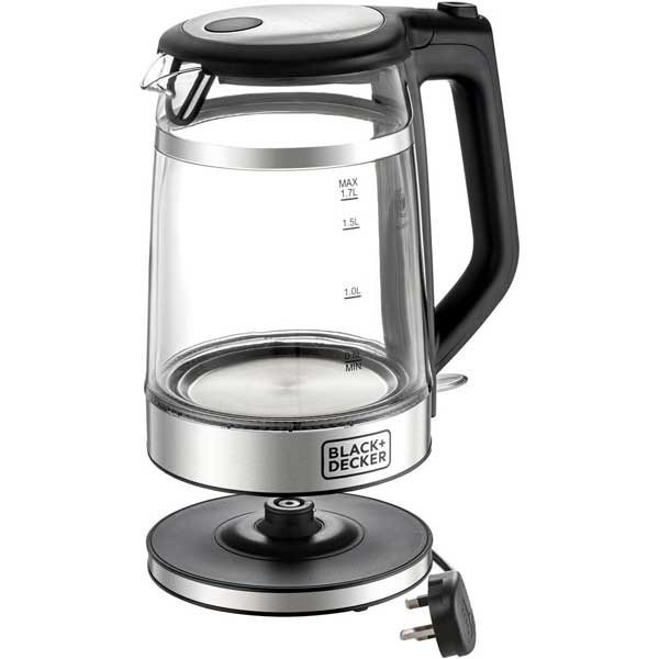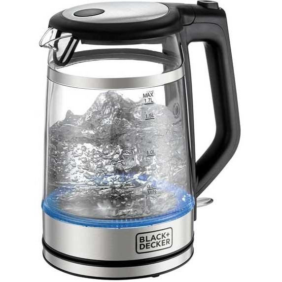 کتری شیشه ای دوجداره ۱.۷ لیتری با روکش فولادی ضد زنگ ممتاز برای دوام بیشتر، محافظ روکش دوجداره برای جذب ضربه های متداول، طراحی بی سیم ۳۶۰ درجه، حلقه LED آبی روشن برای ظاهر و احساس زیبا، ۲۲۰۰ وات، بدنه شیشه بوروسیلیکات، خاموش شدن خودکار،