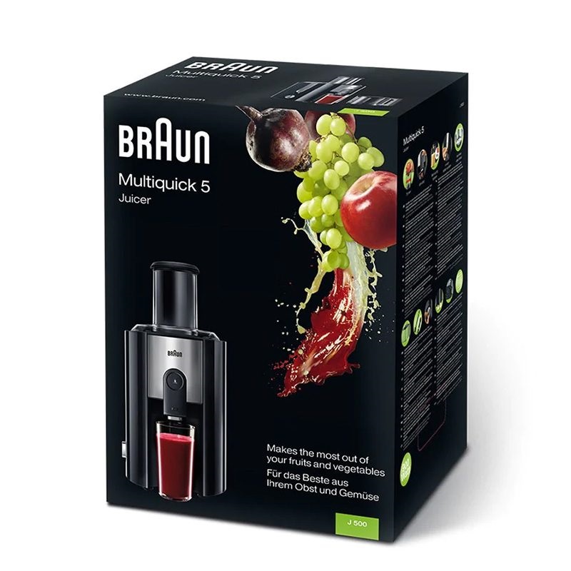 آبمیوه گیری براون مدل J500 با ظرفیت بالایی که دارد هرروز به کار میآید تا نوشیدنی تازه و گوارا و طبیعی تهیه کند. این دستگاه با دارا بودن مخزن تفاله به گنجایش 2 لیتر میتواند برای مدت طولانی کار کند و نیاز به قطع فعالیت به خاطر خالی کردن تفاله ندارد. تیغه اصلی از جنس استیل ضدزنگ است و دهانه دستگاه نیز از قطر مناسب برای گرفتن آب قطعات بزرگ میوه برخوردار است و میتواند انواع میوهجات را بدون آنکه نیاز به خرد کردن آنها باشد، همچون سیب کامل و خرد نشده آبگیری نماید. علاوه بر فیلتر دستگاه که به راحتی قابل شستشو میباشد، لوازم جانبی نیز قابلیت شستشو در ماشین ظرفشویی را دارند. از جمله لوازم جانبی میتوان به پارچ مخزن برای آبمیوه که شفاف و دارای درجه بندی است، و همچنین مخزن تفاله آبمیوه گیری اشاره نمود که به راحتی میتوان آنها را پس از پرشدن از دستگاه جدا نموده و با توقفی کوتاه آنها را خالی و برای ادامه آبگیری روی دستگاه نصب نمود. دهانه خروجی به صورت ضد چکه طراحی شده و پس از اتمام کار به صورت چرخشی مانع از چکیدن آب میوه میگردد. دستگاه مجهز به سیستم ایمنی داخلی بوده که در صورت گرم شدن بیش از حد فعال گردیده و وسیله را خاموش می کند و پس از خنک شدن می توان دوباره مورد استفاده قرار دهید.