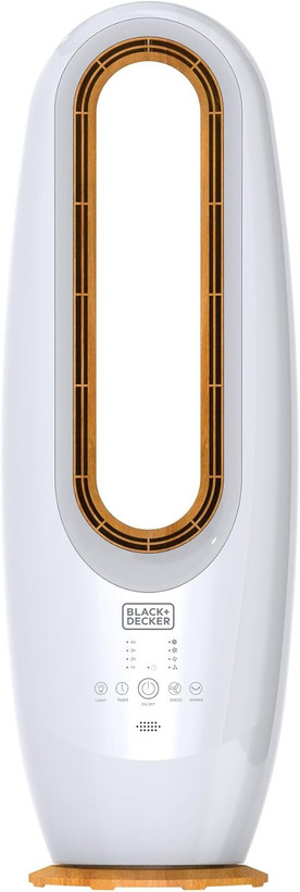 BLACK + DECKER 2 در 1 فن بدون پره، 85 سانتی متر، موتور تروپیکال 70 وات، لامپ LED سرد-سفید، کنترل از راه دور، نوسان عریض 60 درجه، کم صدا، تزئینات چوبی، روکش 40 متر مربع، سفید - FBL85-B5