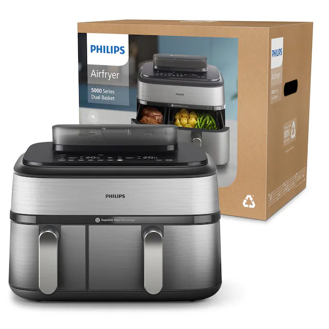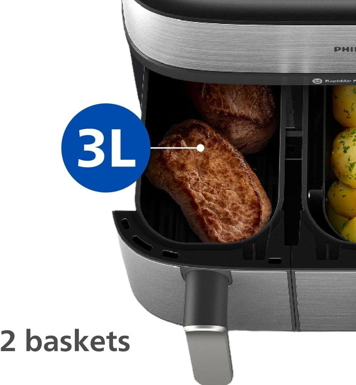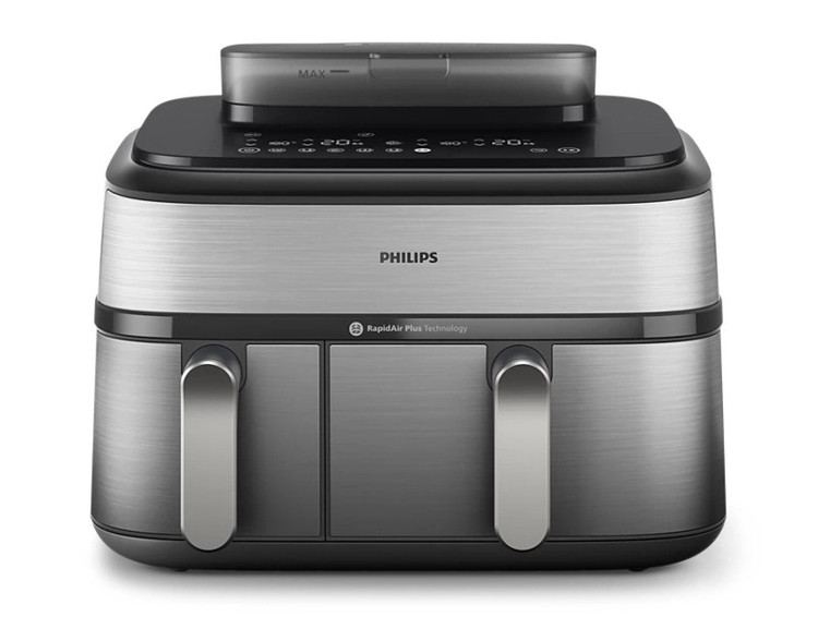 این طراحی دوقلو، امکان پخت همزمان دو غذای متفاوت را با تنظیم جداگانه فراهم میکند. در نتیجه میتوان هم غذا و هم پیشغذا یا دورچین را با یک دستگاه آماده کرد. سبد پخت بزرگ بهصورت متصل به دسته طراحی شده و در مخزن کوچک از سینی جداشونده استفاده شده است که هر دو با پوشش تفلون نچسب ارائه میشوند.