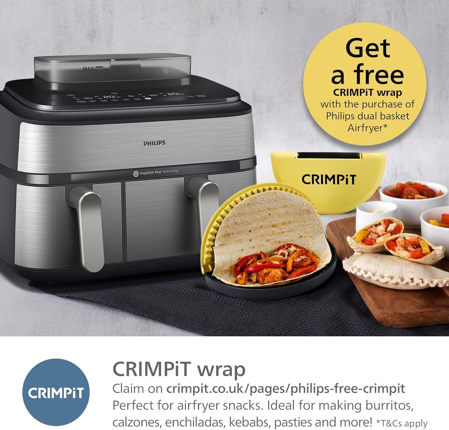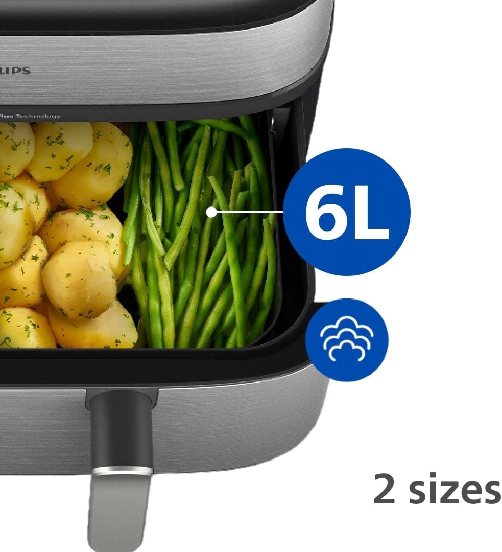 این طراحی دوقلو، امکان پخت همزمان دو غذای متفاوت را با تنظیم جداگانه فراهم میکند. در نتیجه میتوان هم غذا و هم پیشغذا یا دورچین را با یک دستگاه آماده کرد. سبد پخت بزرگ بهصورت متصل به دسته طراحی شده و در مخزن کوچک از سینی جداشونده استفاده شده است که هر دو با پوشش تفلون نچسب ارائه میشوند.