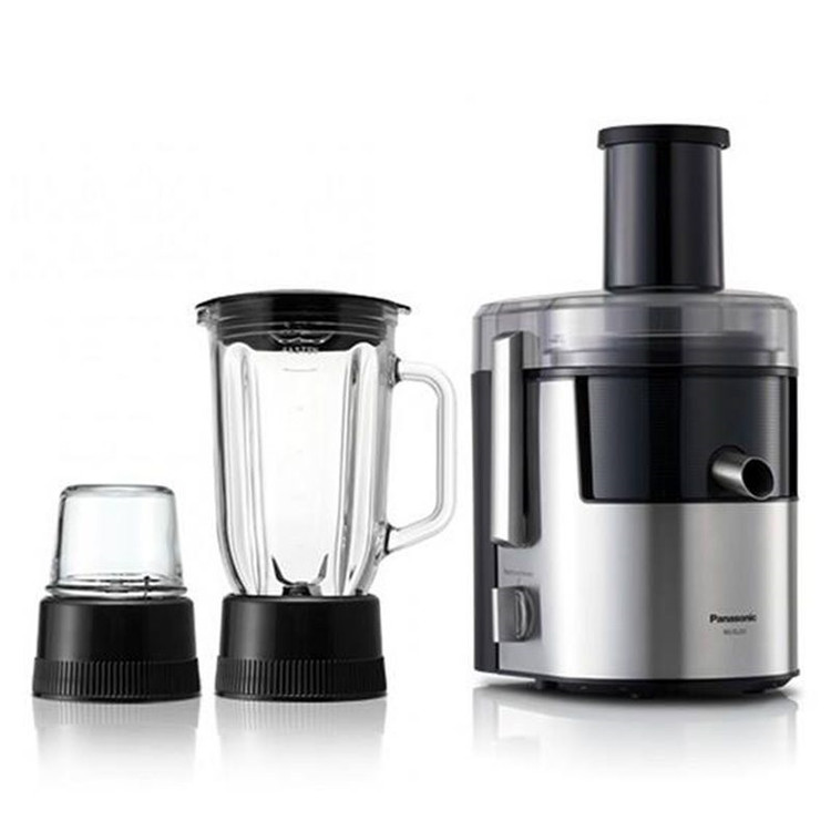 آبمیوه گیری پاناسونیک مدل PANASONIC MJ-DJ31STN یک محصول قدرتمند از این برند معتبر است. مکانیزم تیغه های استیل ضد زنگ این دستگاه به گونه ای است که میوه را در زمان آب گیری محکم نگه داشته و نیروی گریز از مرکز با ثابت نگه داشتن و جلوگیری از چرخش میوه فشار بیشتری را برای فرایند آب گیری به میوه وارد میکند. دهانه ورودی دستگاه با قطر 75 میلیمتر این امکان را میدهد تا میوه ها و سبزیجات قطع بزرگ را نیز به طور کامل و بدون قطعه قطعه کردن درون دستگاه آب گیری کنید. ظرفیت مخزن آب میوه 1.5 لیتر و مخزن تفاله 2 لیتر است که میزان مناسبی از آبمیوه طبیعی را در اختیار شما قرار میدهد. یک دهانه گردان 120 درجه ای روی آبمیوه گیری PANASONIC MJ-DJ31STN تعبیه شده تا افراد دور یک میز همگی برای ریختن آب میوه در لیوان خود به آسانی دهانه را به سمت خود حرکت دهند. توان موتور این دستگاه 800 وات و در 2 سرعت قابل تنظیم میباشد. مکانیزم ساخت دستگاه به گونه ای است که هم در حین عملیات آب میوه گیری و هم در حین ریختن در لیوان قطره ای روی دستگاه چکه و محیط را کثیف نخواهد کرد. همچنین وجود دیگر تیغه های MJ-DJ31STN به شما امکان استفاده برای فرایندهای آسیاب و یا مخلوط کن را نیز میدهد. تیغه ها و فیلترها از جنس استیل ضد زنگ بوده بنابراین به راحتی قابل شستشو و تمیز کردن میباشند.