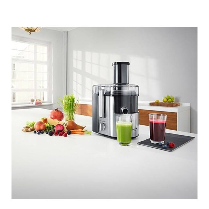آبمیوه گیری پاناسونیک مدل PANASONIC MJ-DJ31STN یک محصول قدرتمند از این برند معتبر است. مکانیزم تیغه های استیل ضد زنگ این دستگاه به گونه ای است که میوه را در زمان آب گیری محکم نگه داشته و نیروی گریز از مرکز با ثابت نگه داشتن و جلوگیری از چرخش میوه فشار بیشتری را برای فرایند آب گیری به میوه وارد میکند. دهانه ورودی دستگاه با قطر 75 میلیمتر این امکان را میدهد تا میوه ها و سبزیجات قطع بزرگ را نیز به طور کامل و بدون قطعه قطعه کردن درون دستگاه آب گیری کنید. ظرفیت مخزن آب میوه 1.5 لیتر و مخزن تفاله 2 لیتر است که میزان مناسبی از آبمیوه طبیعی را در اختیار شما قرار میدهد. یک دهانه گردان 120 درجه ای روی آبمیوه گیری PANASONIC MJ-DJ31STN تعبیه شده تا افراد دور یک میز همگی برای ریختن آب میوه در لیوان خود به آسانی دهانه را به سمت خود حرکت دهند. توان موتور این دستگاه 800 وات و در 2 سرعت قابل تنظیم میباشد. مکانیزم ساخت دستگاه به گونه ای است که هم در حین عملیات آب میوه گیری و هم در حین ریختن در لیوان قطره ای روی دستگاه چکه و محیط را کثیف نخواهد کرد. همچنین وجود دیگر تیغه های MJ-DJ31STN به شما امکان استفاده برای فرایندهای آسیاب و یا مخلوط کن را نیز میدهد. تیغه ها و فیلترها از جنس استیل ضد زنگ بوده بنابراین به راحتی قابل شستشو و تمیز کردن میباشند.