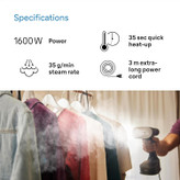 قدرتمند 1600 وات: QuickStyle 7 از 1600 وات برای اتو کردن عمودی سریع و بدون دردسر استفاده می کند و تا 35 گرم در دقیقه بخار مداوم را برای از بین بردن چین و چروک ها تحویل می دهد و پارچه های خود را به سرعت تازه می کند.