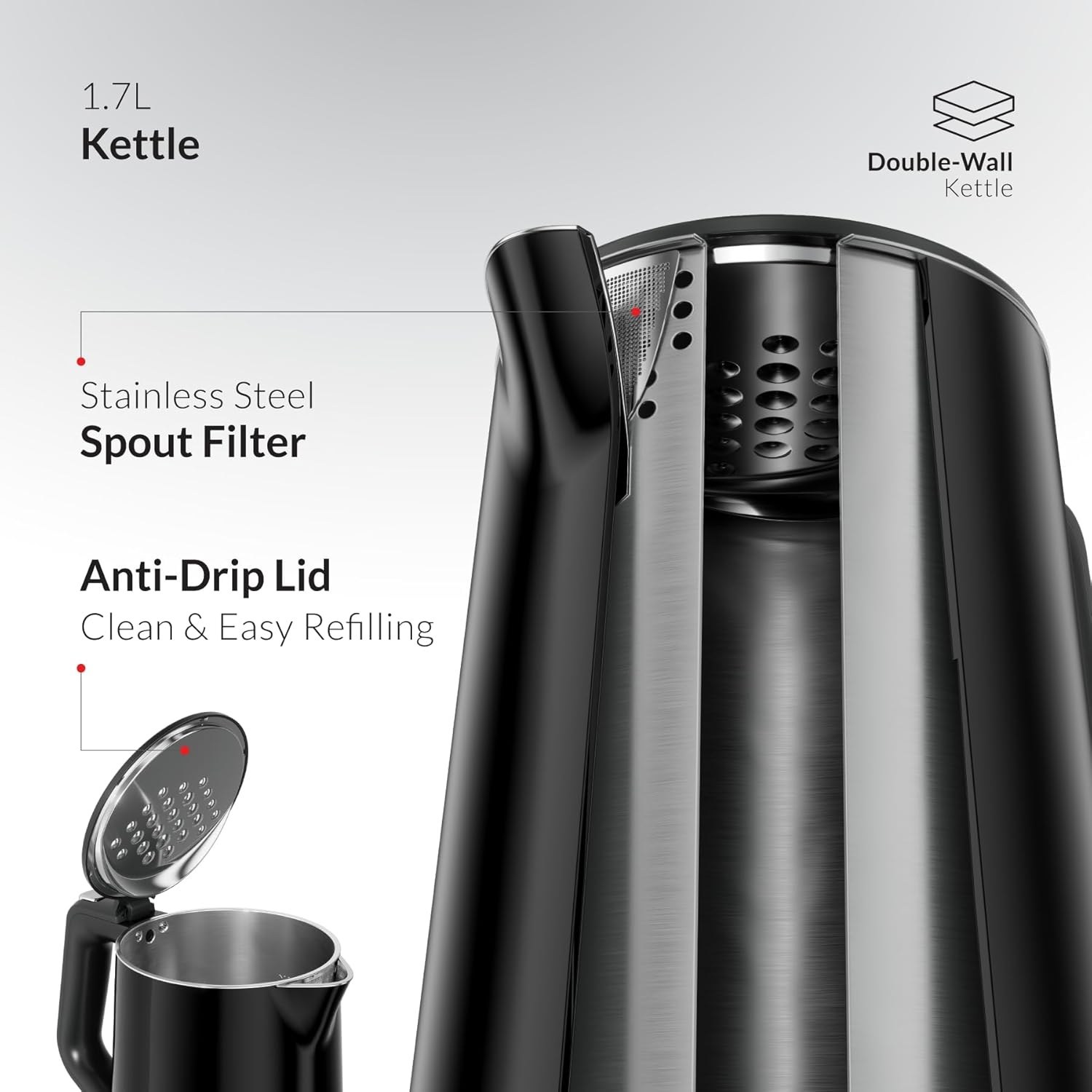 کنترل دمای دوگانه: به شما امکان میدهد دماهای جداگانهای را برای کتری دوجداره ۱.۷ لیتری و صفحه گرمکننده قوری هوشمند تنظیم کنید,تنظیمات راحتی را در دمای ۴۰، ۸۰، ۹۰ و ۱۰۰ درجه سانتیگراد به همراه عملکرد گرم نگه داشتن برای کتری