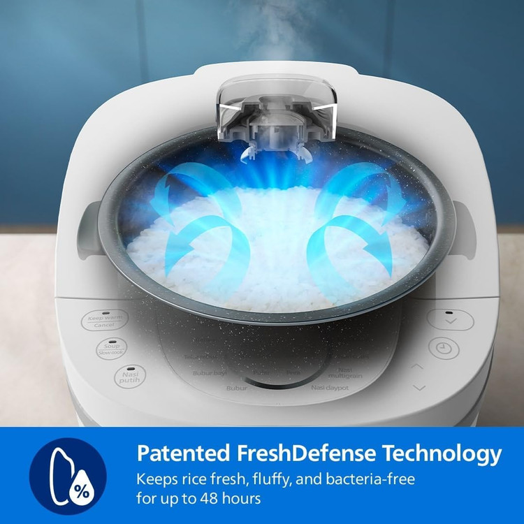 FLUFFY RICE EVERY TIME – فناوری پیشرفته FreshDefense تا 48 ساعت در سطح رطوبت عالی قفل می شود. شیر بخار دو کاناله برنج سفید، نرم و خوشمزه را تضمین می کند