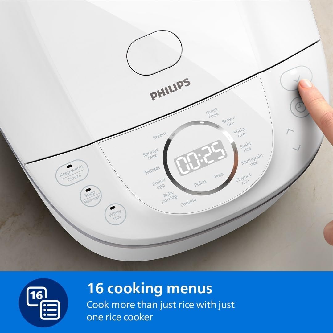با پلوپز دیجیتالی فیلیپس سری ۳۰۰۰، در تمام طول روز از برنج کاملاً پفدار لذت ببرید. بافت ایدهآل برنج سفید و پفدار را تا ۴۸ ساعت تضمین کنید، ۱۶ منوی پخت خودکار را برای یک تجربه آشپزی متنوع و آسان