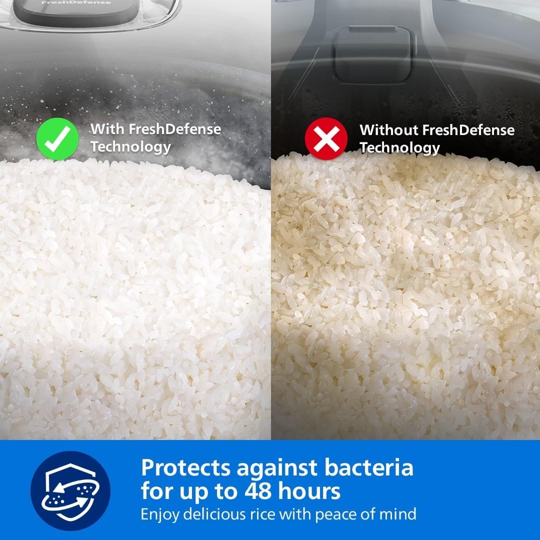 FLUFFY RICE EVERY TIME – فناوری پیشرفته FreshDefense تا 48 ساعت در سطح رطوبت عالی قفل می شود. شیر بخار دو کاناله برنج سفید، نرم و خوشمزه را تضمین می کند