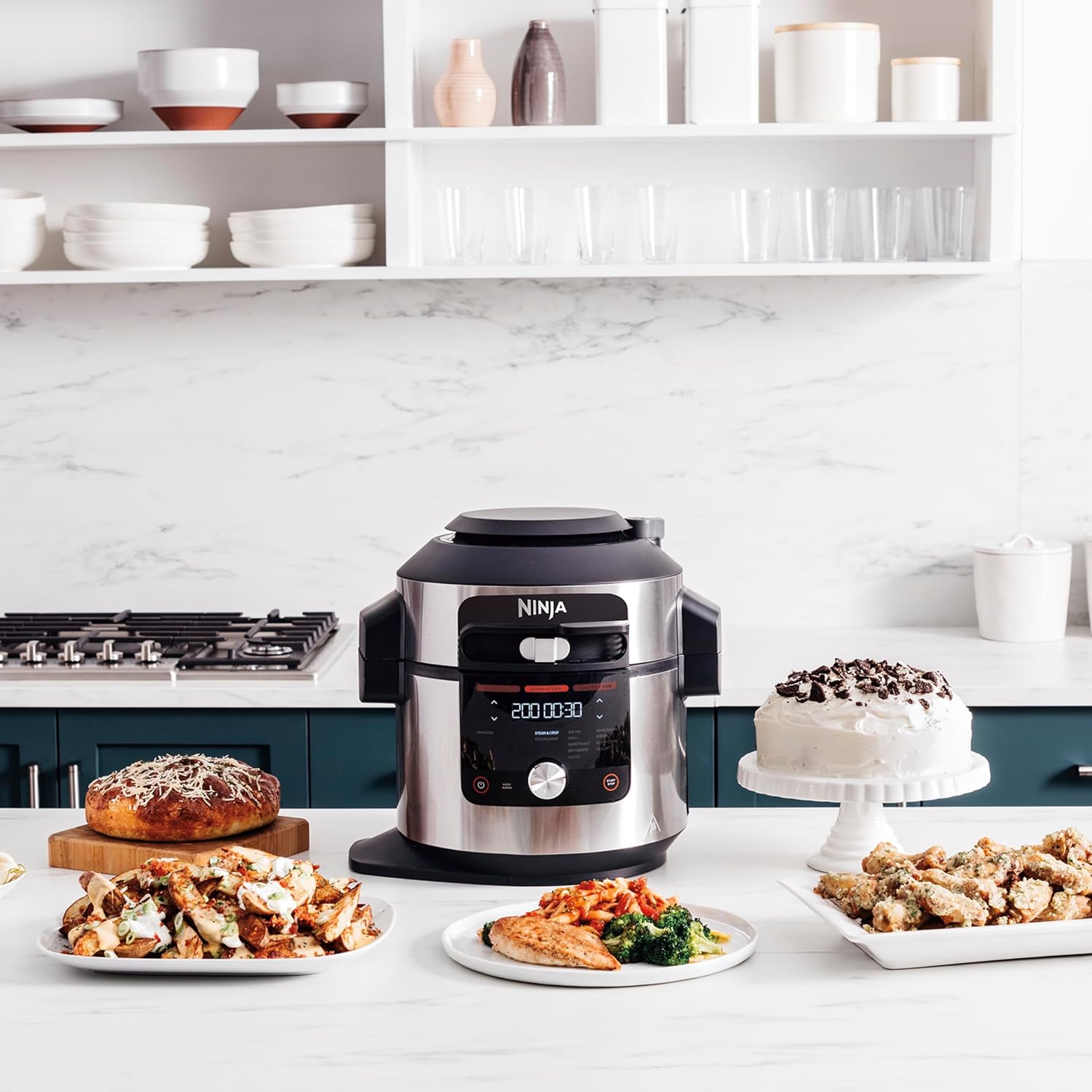 مولتی کوکر نینجا مدل OL750 نسل جدید از لوازم پخت و پز این برند معتبر است که شما را در انجام امور متنوع آشپزی همراهی میکند. این دستگاه قدرتمند با توان ۱۷۶۰ وات ۳ فرایند اصلی پخت یعنی زودپز، سرخ کن و آرامپز را بهبهترین شکل بهانجام میرساند. علاوه بر این، ۵ برنامه مختص فرایند ترکیبی پخت با بخار، گریل، پختن، خشک کردن مواد غذایی، تفت دادن، بخارپز، ماست ساز و گرم نگهدارنده دیگر عملکردهای این محصول را تشکیل میدهند. فرایندهای اصلی ذکر شده با حرکت دادن دکمه اسلایدر روی دستگاه انتخاب شده و پس از آن عملکردهای دستهبندی مربوط به آن نیز با استفاده از کنترلکننده چرخشی و دکمههای لمسی قابل اعمال خواهند بود. یکی دیگر از ویژگیهای ارزشمند این دستگاه برخورداری از قطعه کاوشگر میزان پخت مواد غذایی است. در حقیقت بهلطف تعبیه این قطعه هیچگونه حدس و گمانی در مورد میزان پخت مواد غذایی باقی نمیماند و با کنترل مستمر دمای غذا در حین فرایند، غذایی کاملا مطابق با سلیقه پخت کاربر در اختیار او قرار میدهد. به ادعای کمپانی نینجا دیگر امتیاز ارزشمند این دستگاه سرعت بالا در انجام عملکردهای متنوع آشپزی است. به گفته این شرکت بهکمک فرایند آشپزی با بخار این مولتی کوکر در مدت کمتر از ۶۰ دقیقه قادر به پخت یک مرغ بریان کامل خواهید بود یا از طریق انتخاب سایر عملکردها ظرف مدت کمتر از ۳۰ دقیقه وعده غذایی خانوادگی موردنظر خود را آماده خواهید کرد. از طریق انتخاب برنامه زودپز این محصول، تا میزان ۷۰ درصد سریعتر به نسبت روشهای سنتی پخت به نتیجه دلخواه خود دست پیدا میکنید. سیستم گردش هوای داغ درست شبیه به مکانیزم یک دستگاه سرخ کن در این مولتی کوکر نیز تعبیه شده است. از همین بابت فرایند سرخ کردن مواد غذیی نیز با مصرف کمترین میزان روغن و بهگونهای کاملا سلامت قابل انجام خواهد بود. مخزن پخت این مولتی کوکر با دارا بودن ظرفیت ۷.۵ لیتری حجم مناسبی از مواد غذایی را در خود جای میدهد. این ظرفیت معادل تهیه وعده غذایی برای جمع ۶ نفره یا پخت یک مرغ کامل ۳ کیلوگرمی است. متریال ساخت کاسه پخت از سرامیک نانو بوده که ضمن حفظ اصالت طعم مواد غذایی، شستشوی آسان و بدون دردسر را نیز موجب میشود. علاوه بر این کاسه دیگر اقلام جانبی دستگاه شامل دو سینی توری فلزی و یک پایه نگهدارنده دو طبقه برای انجام فرایندهای گریل، بخارپز کردن و پخت و یک عدد پروب یا کاوشگر سنجش میزان پخت مواد غذایی میشود. گفتنی است امکان شستشوی قطعات جانبی دستگاه در ماشین ظرفشویی وجود دارد.