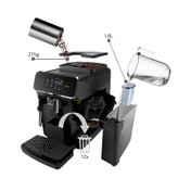 هشدار صوتی خالی بودن مخزن آب برای جلوگیری از آسیب رسیدن به دستگاه، هشدار صوتی برای گیر کردن دانه و یا پودر قهوه در داخل مخزن و سیستم ایمنی خاموش شدن برای جلوگیری از بروز حادثه به شما امکان استفاده از این دستگاه را با خاطر آسوده میدهد. اسپرسوساز تمام اتوماتیک EP2220 شرکت Philips با طراحی جذاب، رنگ آمیزی مشکی، نمایشگر دیجیتال و صفحه کنترل لمسی به جذابیت این دستگاه میافزاید و همچنین زیبایی دوچندانی به محیط آشپزخانه منزل شما میبخشد. فاصله ایدهآل نازل اسپرسو تا لیوان موجب میشود تا طیف گستردهای از لیوانها را بتوانید مستقیم به زیر نازل ببرید و نوشیدنی خود را آماده کنید. قابلیت نوردهی کلیدها به شما این امکان را میدهد تا در تاریکی نیز بتوانید بدون ایجاد مزاحمت برای کسی از نوشیدن یک لیوان قهوه لذیذ لذت ببرید. صفحه گرم نگه دارنده فنجانها آخرین موردی است که شرکت فیلیپس برای شما تعبیه کرده است، برای درست کردن یک لیوان لته لذیذ دیگر نیاز به گرم کردن لیوان با آب جوش نیست و میتوانید پیش از درست کردن آن، لیوان خود را روی صفحه گرم نگهدارنده قرار دهید تا لته شما در دمای ایدهآل آماده گردد.