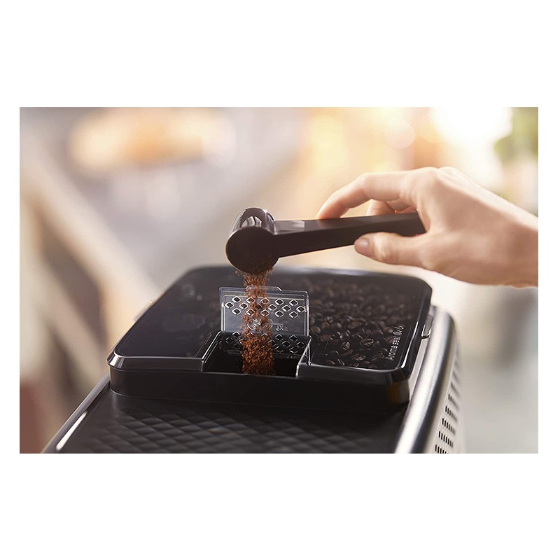 شرکت فیلیپس در تولید دستگاه اسپرسو ساز از یک آسیاب خودکار استفاده کرده است تا کار شما آسانتر و همچنین حرفهایتر بشود. دانههای قهوه هرچقدر از زمان آسیاب شدنش بگذرد طعم و عطر خود را بسته به شرایط نگهداری نادرست از دست میدهد، ولی در این دستگاه با استفاده از یک آسیاب سرامیکی در داخل آن اقدام به آسیاب دانههای قهوه برای درست کردن یک شات سینگل و یا دبل اسپرسو میکند. این آسیاب بهصورت یک دست دانههای قهوه را با سایز قهوه اسپرسو برای شما آسیاب کرده تا از نوشیدن یک لیوان قهوه خوش عطر و طعم نهایت لذت را ببرید. ظرفیت مخزن قهوه ۲۷۵ گرم و جنس آن از پلاستیک است.