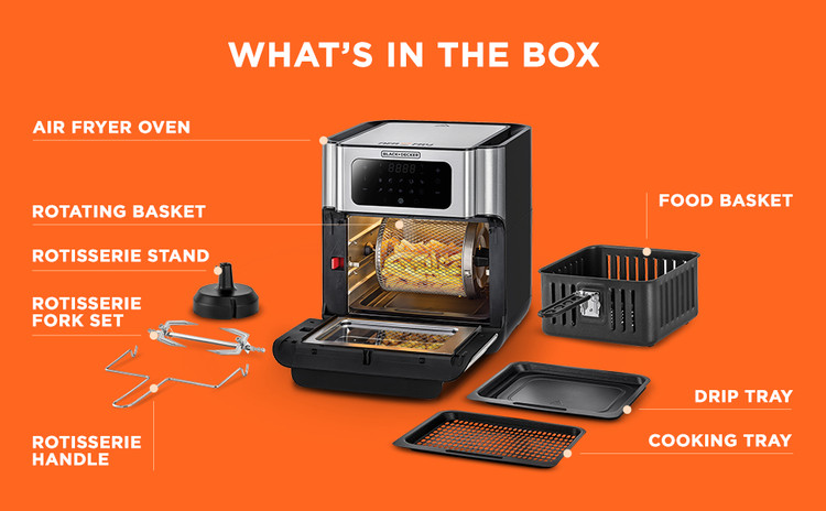 کمپانی بلک اند دکر در داخل جعبه این سرخ کن دو عدد سینی پخت، یک سیخ جوجه گردان و یک سبد سرخ کن قرار داده که شما با توجه به نوع برنامه پخت انتخابی میتوانید مواد غذایی را داخل یکی از آن ها بریزید و داخل دستگاه قرار دهید.