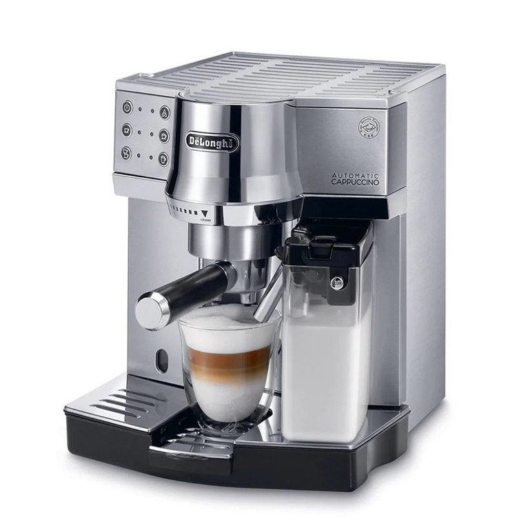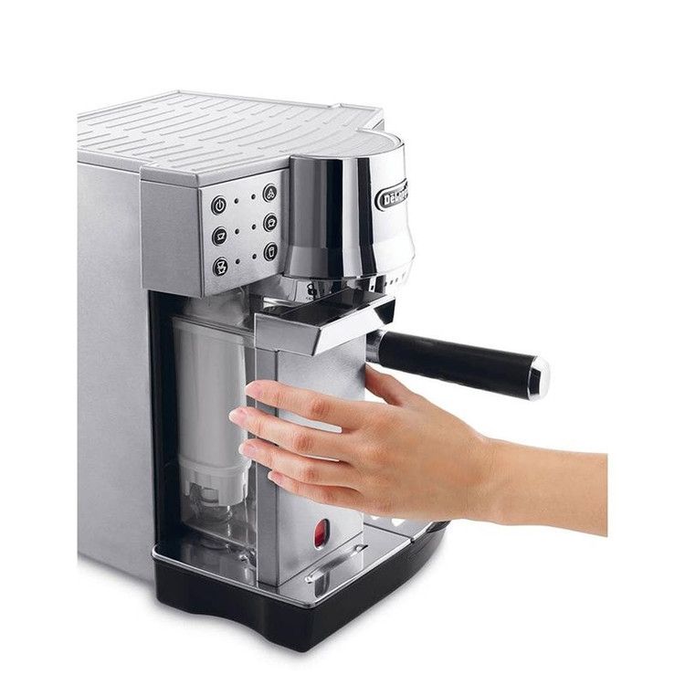 اسپرسو دلونگی مدل EC850.M دستگاهی با امکانات خوب و مدرن برای تهیه انواع قهوه است. جنس بدنه دستگاه استیل ضد زنگ می باشد که این استحکام زیبایی فوق العاده ای به محصول داده است. توان این دستگاه 1450 و فشار بخار 15 بار است که فشار بخار در این مدل باعث شده تا قهوه با کیفیت و خوبی تهیه شود. این دستگاه برای نگهداری دانه قهوه مخزنی نداشته و باید از قهوه آسیاب شده استفاده کرد. نوشیدنی های قابل تهیه با EC850.M کاپوچینو، اسپرسو، لاته ماکیاتو، آمریکانو، آب داغ و شیر داغ می باشد. همچنین مخزن آب با ظرفیت 1 لیتر در پشت دستگاه و مخزن شیر در جلوی دستگاه قرار دارد. طراحی این دستگاه طوریست که جایگاهی برای نگهداری فنجان در نظر گرفته شده است. مصرف انرژی این مدل بسیار پایین است و در رده انرژی A قرار می گیرد.
