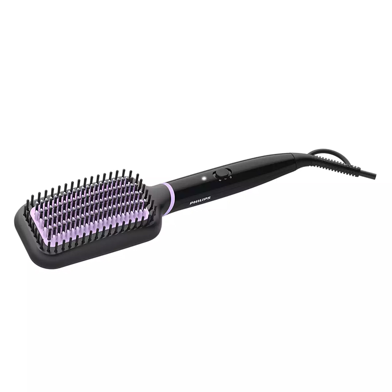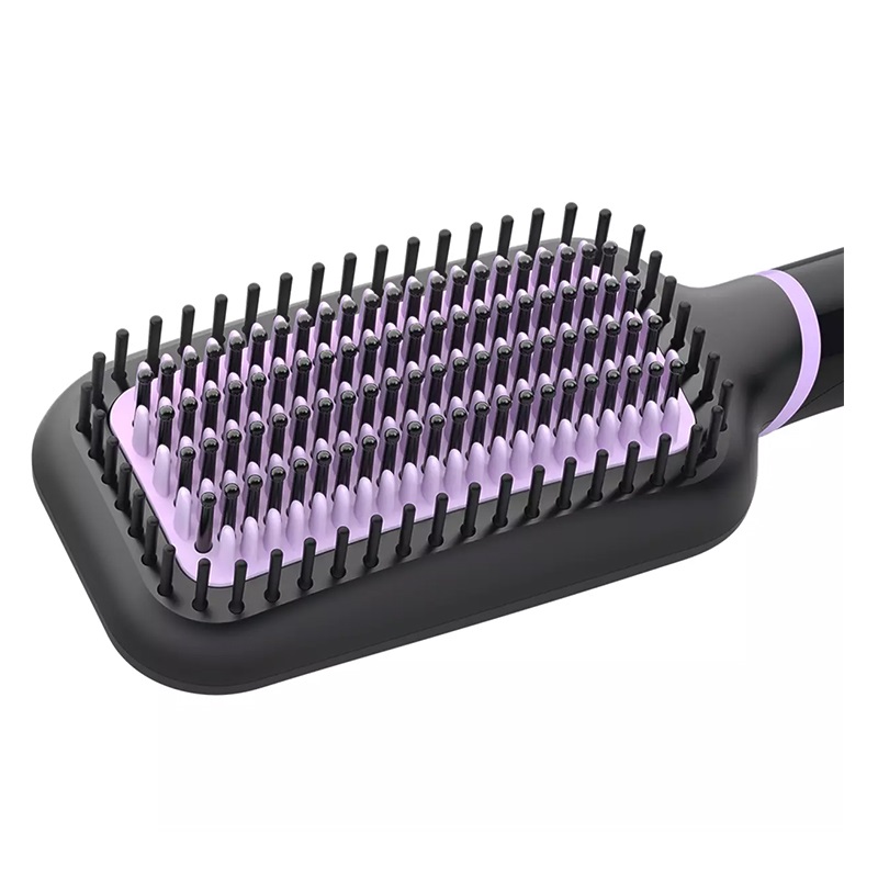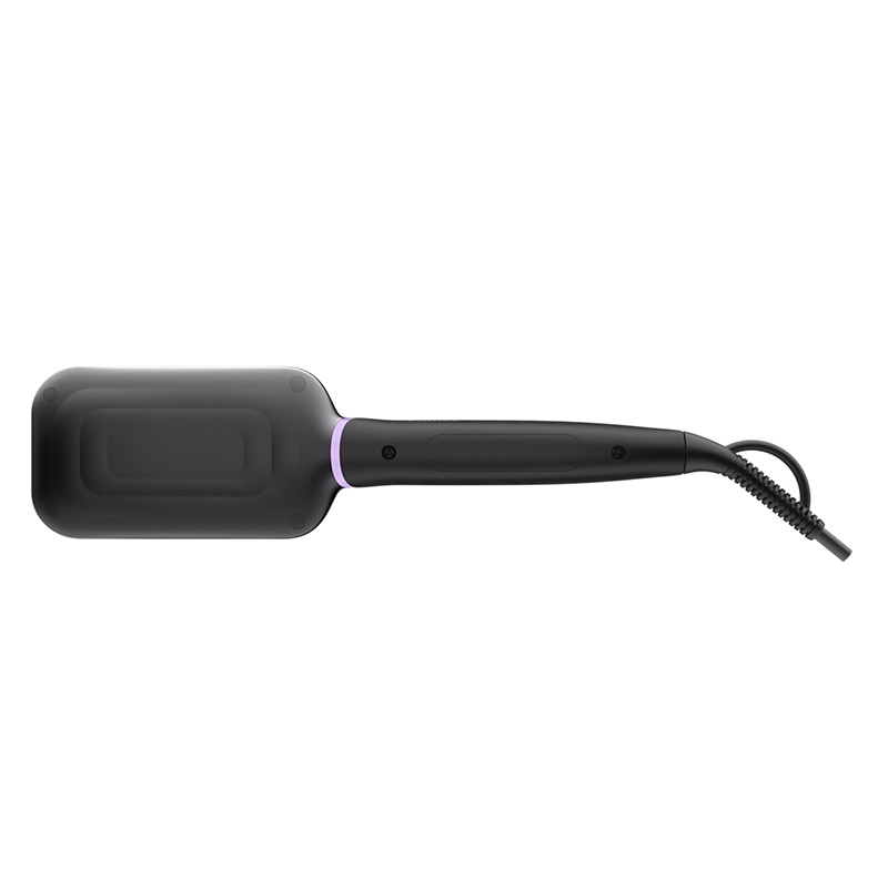 برس حرارتی مو فیلیپس مدل BHH880 قادر است تنها در مدت زمان 5 دقیقه فرایند حالت دهی و یا صاف کردن موهای شما را بدون برجای ماندن وز بر روی آن به انجام برساند. برخورداری این برس از پوشش سرامیکی تورمالین سبب شده ضمن ایجاد حرکتی روان بر روی موها، از ایجاد وز بر روی موها جلوگیری شده و ظاهری صاف و براق به آنها ببخشد. محافظت از مو در برابر اعمال حرارت بیش از اندازه امری قابل توجه در فرایند رسیدگی روزانه به موها به شمار میآید. از همین رو این دستگاه با بهرهگیری از فناوری ThermoProtect با تنظیم خودکار دمای بهینه و متناسب برای حالت دهی موهای سر، از ایجاد دمای بیش از اندازه جلوگیری کرده و از سلامت موها در حین انجام فرایند محافظت میکند. طراحی دندانههای این برس در 3 ردیف با چینشی مناسب، مانع از گیر کردن و گره خوردن موها در آن شده و در عین حال از پوست سر نیز در برابر حرارت مراقبت میکند. سطح این برس دارای ابعاد قابل توجه 6 سانتیمتر مربع بوده و از طراحی پارویی شکل بهره میبرد. داغ و آماده بهکار شدن برس حرارتی مو فیلیپس در مدت زمان 50 ثانیه صورت میپذیرد. پس از آن با استفاده از امکان تنظیم دما قادر به شروع فرایند حالت دهی بر روی موهای خود خواهید بود؛ تنظیمات دمایی در 2 سطح و در دماهای 170 درجه و همچنین 200 درجه سانتیگراد متناسب با نوع جس مو و نیز فرایند موردانتظار شما قابل کنترل است. توصیه میشود از سطح دمایی 170 درجه بهمنظور حالت دهی موهای آسیبدیده و یا معمولی و از سطح دمایی 200 درجه در جهت رسیدگی و کار بر روی موهای ضخیم و فرایندهای حالت دهی دشوارتر استفاده شود. آماده بهکار بودن دستگاه از طریق چراغ نشانگر تعبیه شده بر روی بدنه آن قابل مشاهده است. برخورداری محصول از کابل برق 1.8 متری چرخان حداکثر انعطافپذیری و دسترسی آسان به تمامی قسمتهای مو را مهیا کرده است. گفتنی است سیستم ایمنی دستگاه پس از انجام مداوم فرایند تا مدت زمان 60 دقیقه، برس را به طور خودکار خاموش خواهد کرد