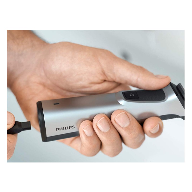 ماشین اصلاح فیلیپس مدل PHILIPS MG7715، با بهره گیری از 11 ابزار برتر شما را قادر میسازد تا سبک منحصر بفرد اصلاح خود را انتخاب کنید. فناوری DualCut تیغه ها عملکرد آن ها را تا 2 برابر نسبت به تیغه های یک طرفه بهبود بخشیده است که اثر بخشی آن پس از 5 سال استفاده به قوت خود باقی خواهد ماند. 11 ابزار موجود در اقلام ماشین اصلاح MG7715 کمک میکند روند آسانی در جهت اصلاح موی سر و صورت و داخل بینی و حتی بدن خود داشته باشید. تیغه های DualCut همچنین برای ایجاد خط ریش و خط موهای پشت گردن نیز انتخاب مناسبی هستند. دستگاه شامل 8 شانه برای اصلاح موهای سر و صورت و بدن از قبیل 2 شانه ریز 1 و 2 میلیمتری، 1 شانه مخصوص اصلاح ریش 3 تا 7 میلیمتری، 3 شانه اصلاح موی سر 9،12 و 16 میلیمتری و 2 شانه اصلاح موی بدن 3 و 5 میلیمتری میباشد. ماشین اصلاح فیلیپس MG7715 دارای باتری ای قدرتمند از نوع لیتیوم-یونی است که با هر بار شارژ کامل به مدت 1 ساعت، امکان استفاده به صورت بی سیم تا مدت زمان 2 ساعت را دارد. طراحی ارگونومیک بدنه موجب خوش دست بودن و عدم لغزندگی دستگاه در حین استفاده شده است. ضد آب بودن تیغه های استیل و بدنه دستگاه امکان استفاده بی دغدغه از آن را در زیر دوش حمام و محیط روشویی و یا همچنین شستشو دستگاه زیر آب به راحتی مهیا میکند.