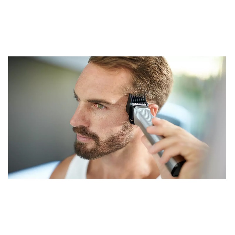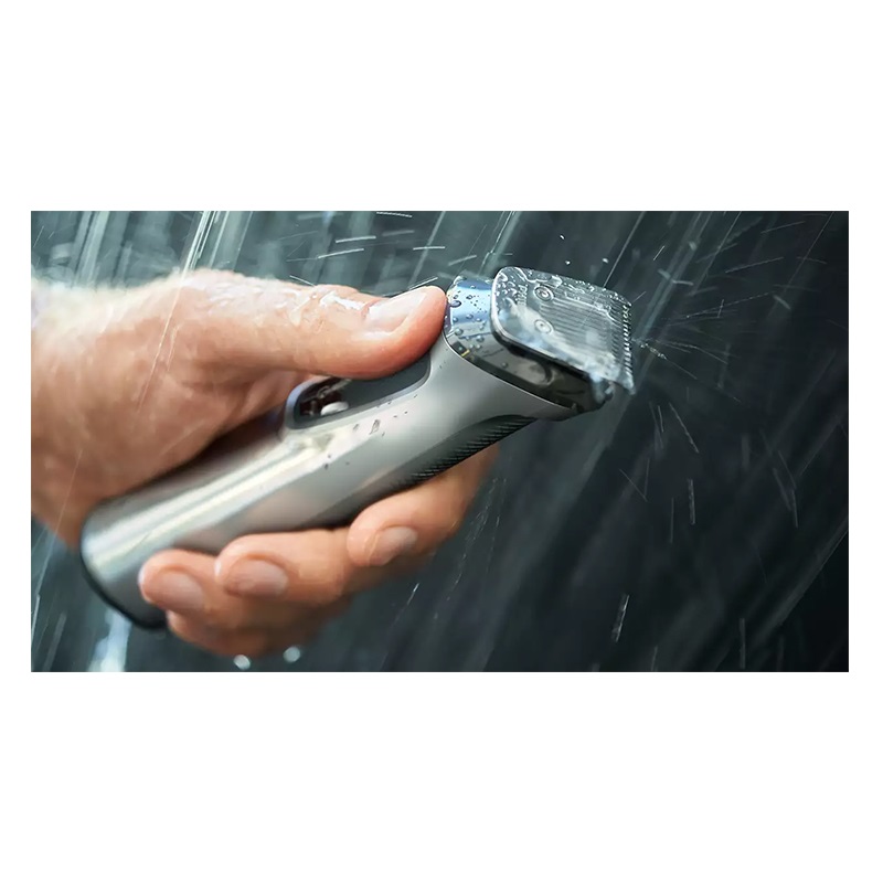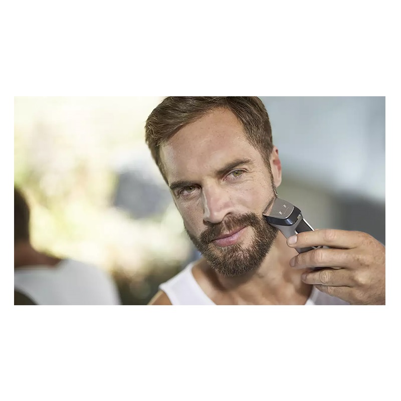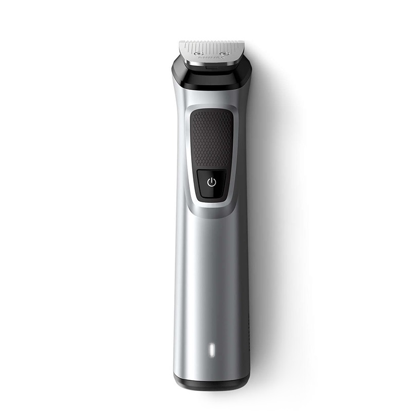 ماشین اصلاح فیلیپس مدل PHILIPS MG7715، با بهره گیری از 11 ابزار برتر شما را قادر میسازد تا سبک منحصر بفرد اصلاح خود را انتخاب کنید. فناوری DualCut تیغه ها عملکرد آن ها را تا 2 برابر نسبت به تیغه های یک طرفه بهبود بخشیده است که اثر بخشی آن پس از 5 سال استفاده به قوت خود باقی خواهد ماند. 11 ابزار موجود در اقلام ماشین اصلاح MG7715 کمک میکند روند آسانی در جهت اصلاح موی سر و صورت و داخل بینی و حتی بدن خود داشته باشید. تیغه های DualCut همچنین برای ایجاد خط ریش و خط موهای پشت گردن نیز انتخاب مناسبی هستند. دستگاه شامل 8 شانه برای اصلاح موهای سر و صورت و بدن از قبیل 2 شانه ریز 1 و 2 میلیمتری، 1 شانه مخصوص اصلاح ریش 3 تا 7 میلیمتری، 3 شانه اصلاح موی سر 9،12 و 16 میلیمتری و 2 شانه اصلاح موی بدن 3 و 5 میلیمتری میباشد. ماشین اصلاح فیلیپس MG7715 دارای باتری ای قدرتمند از نوع لیتیوم-یونی است که با هر بار شارژ کامل به مدت 1 ساعت، امکان استفاده به صورت بی سیم تا مدت زمان 2 ساعت را دارد. طراحی ارگونومیک بدنه موجب خوش دست بودن و عدم لغزندگی دستگاه در حین استفاده شده است. ضد آب بودن تیغه های استیل و بدنه دستگاه امکان استفاده بی دغدغه از آن را در زیر دوش حمام و محیط روشویی و یا همچنین شستشو دستگاه زیر آب به راحتی مهیا میکند.