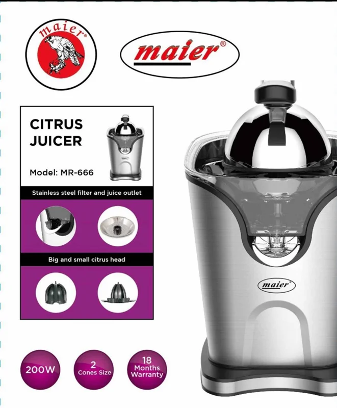 مشخصات کلی رنگ استیل نوع دستگاه آب مرکباتگیری اهرمی کارکرد تک کاره توان مصرفی 200 وات نحوه عملکرد اهرم فشاری تعداد سری آب مرکبات گیری 2 عدد جنس بدنه استیل ضد زنگ, پلاستیک جنس دسته آلومنیوم با روکش کروم جنس مخروطی پلاستیک جنس صافی استیل ضد زنگ پایه ضد لغزش دارد سیستم ضد چکه دارد طول کابل 150 سانتی متر سایر مشخصات - داری درپوش محافظ, - قابلیت آبگیری با سایز کوچک اقلام همراه - مخزن تفاله, - دفترچه ی راهنما ابعاد 18x16x27 سانتیمتر