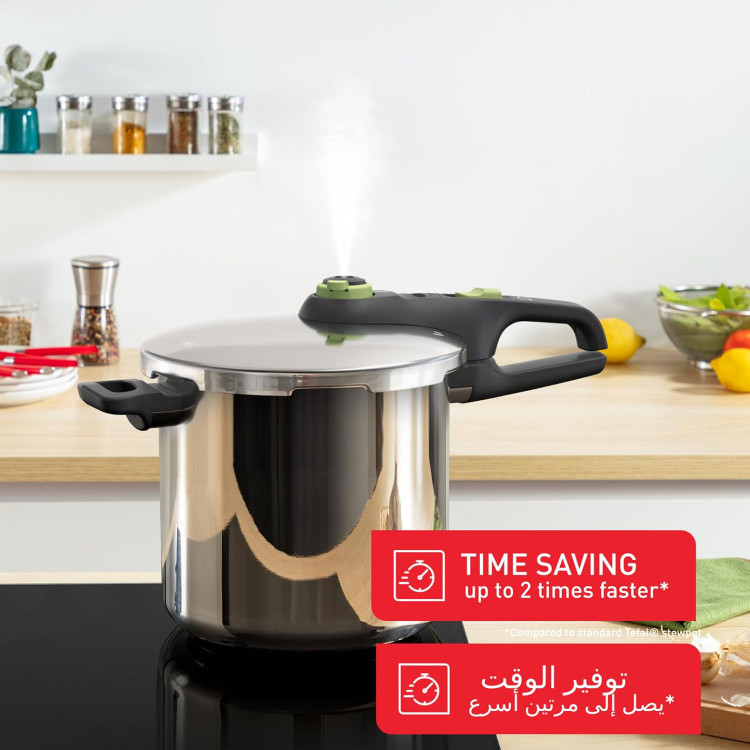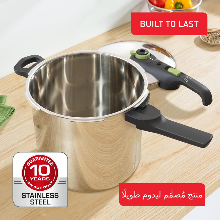 درب زودپز TEFAL P2584402 دارای دستگیره قفل شونده بوده و از ایمنی بسیار بالایی برخوردار است. این محصول به دو دسته با جنس باکالیت مجهز شده است که یکی از آن ها کوتاه و دیگری بلند است. این وسیله دارای پنج سیستم ایمنی در سوپاپ، درب و بدنه است و درب آن با کشیدن ضامن به سمت عقب باز می شود. زودپز tefal دارای سوپاپ تنظیم فشار پخت در دو سطح مختلف مخصوص سبزیجات، گوشت و مرغ بوده و با اعمال فشار ۱۲ بار به پخت غذاها می پردازد.