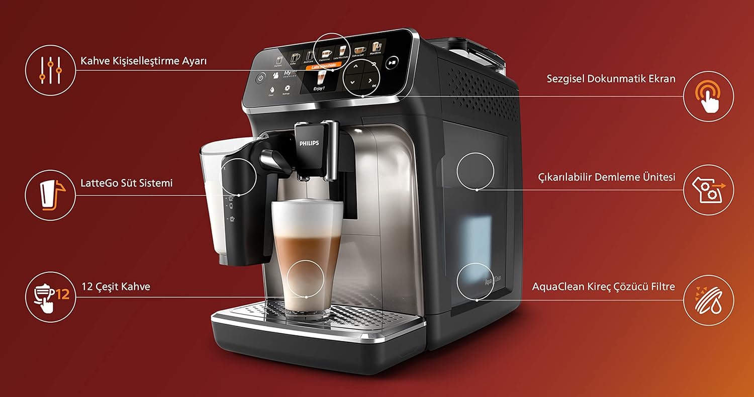 اسپرسوساز فیلیپس مدل EP5447 تمامی نیازهای شما در جهت انجام کلیه مراحل تهیه نوشیدنی موردنظر را مرتفع کرده و با توجه به توانایی ارائه امکاناتی در سطح بالا قادر است یک کافی شاپ کوچک را به خانه شما بیاورد. از ابتداییترین فرایند تهیه یک فنجان قهوه یعنی آسیاب دانهها گرفته تا تهیه یک نوشیدنی خوش طعم همگی به کمک این دستگاه به صورت تمام اتوماتیک قابل انجام است. طراحی ویژه این محصول با برخورداری از صفحه کنترل لمسی و نمایشگر TFT با رابط کاربری آسان، دستگاهی خوشساخت را تشکیل داده است. بهرهگیری این دستگاه از توان 1500 وات، مخزن آب 1.8 لیتری و میزان فشار 15 بار به لطف وجود سیستم گرمایش بلوک حرارتی موسوم به Thermoblock تهیه نوشیدنی موردنظر با بالاترین کیفیت ممکن را تضمین میکند. 12 نوع برنامه برای تهیه انواع نوشیدنی را در اختیار خواهید داشت؛ از یک نوشیدنی اسپرسوی خوشطعم تا یک کاپوچینوی ایدهآل از طریق این اسپرسوساز تمام اتوماتیک فیلیپس قابل تهیه خواهد بود. وجود سیستم LatteGo در اسپرسوساز فیلیپس مدل EP5447 موجب شده با سرعتی بالا به کف شیری ابریشمی دست پیدا کنید. نوشیدنی قهوه خود را با لایهای ابریشمی و صاف از کف شیر بپوشانید. این سیستم با ترکیب شیر و هوا با سرعت بالا در درون مخزن شیر، یک لایه کرمی کامل از شیر را ارائه میدهد. صفحه لمسی اسپرسوساز در کنار نمایشگر TFT با برخورداری از رابط کاربری قوی، تعویض بین فرایندهای موردانتظار شما را در سریعترین زمان و به بهترین شکل ممکن به انجام میرساند. امکان تنظیم میزان عطر و طعم قهوه و مقدار موردمصرف، اشرافی کامل را از تمامی مراحل انجام فرایند تهیه نوشیدنی در اختیار شما قرار میدهد. وجود عملکرد شات اضافی، مقدار شدت طعم نوشیدنی را بدون افزیش میزان تلخی آن، بالا خواهد برد. همچنین اسپرسوساز فیلیپس مدل EP5447 به لطف وجود سیستم Aroma Extract با ایجاد تعادل بهینه بین دمای دمآوری و عطر قهوه با نگهداری دمای آب بین 90 و 98 درجه سانتیگراد تهیه نوشیدنی موردنظر با بالاترین کیفیت ممکن را تضمین میکند. جنس مخزن آسیاب دستگاه از سرامیک بادوام بوده که با حفظ عطر طبیعی قهوه حاضر است تا میزان 20000 فنجان پودر قهوه را تهیه کند. میزان آسیاب دانههای قهوه بسته به مقدار دلخواه شما در 12 درجه قابل تنظیم خواهد بود. وجود دو نازل امکان تهیه دو فنجان قهوه را مهیا میکند. این نازلها بسته به میزان ارتفاع فنجان و یا لیوان شما قابل تنظیم بوده که این امر از پاشیدن نوشیدنی به خارج از سطح فنجان جلوگیری میکند. نگران وجود رسوب در آب نباشید؛ تعبیه فیلتر AquaClean در مخزن آب موجب شده این قطعه نیازی به رسوب زدایی مداوم دستگاه نداشته و همواره آب را شفاف نگه میدارد بطوریکه تا حداکثر 5000 فنجان احتیاجی به فرایند رسوب زدایی نخواهد داشت. همچنین عملکرد خودکار دستگاه با قابلیت تنظیم میزان سختی آب شما را در مواقعی که دستگاه نیازمند انجام رسوب زدایی است، مطلع خواهد کرد. وجود سیستم ذخیره انرژی و نظافت آسان دستگاه به لطف قابلیت تفکیک قطعات و امکان شستشوی آنها در ماشین ظرفشویی از دیگر امکانات اسپرسوساز فیلیپس مدل PHILIPS EP5447 به شمار میآید.