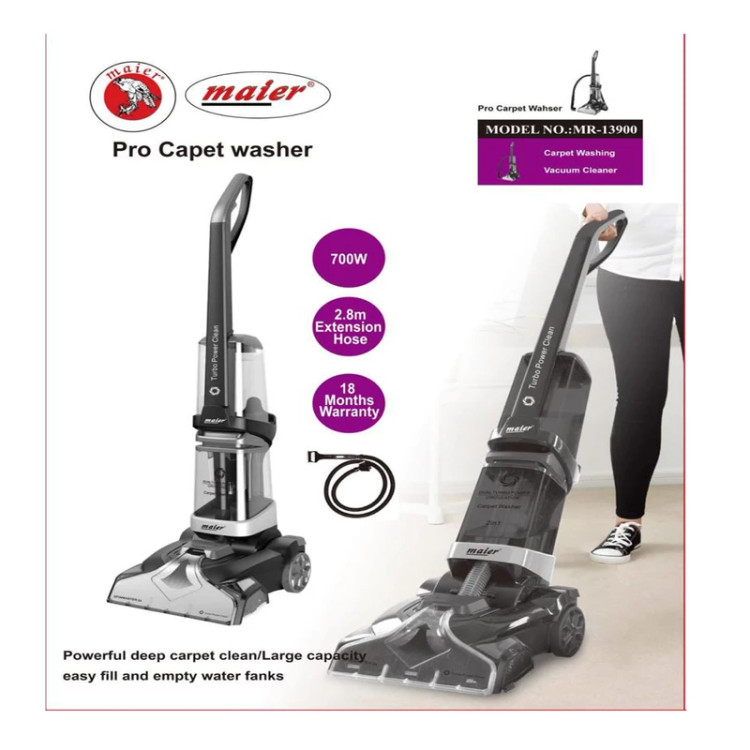 فرش شوی و مبل شوی مایر مدل MR-13900 یکی از دستگاههای ضروری در هر خانهای است که حس تمیزی را به محیط هدیه میدهد. موتور در این فرششوی از نوع توربو میباشد که با قدرت بالا موجب از بین رفتن انواع لکهها بر روی فرش، مبل و یا موکت در محیط میگردد. این دستگاه با وزن سبک ۵ کیلوگرم به سادگی قابل حمل میباشد و تمیزی را به خانهی شما میآورد.این دستگاه با توان مصرفی ۷۰۰ وات و قدرت بالا میتواند فرشهایی با تراکم بالا را نی به سادگی تمیز نماید. مخازن، شیلنگ و دیگر قسمتها در این قالی شوی به راحتی از هم جدا میشوند و میتوانید پس از هر بار استفاده آنها را به آسانی بشویید. این فرششوی دارای ۲ مخزن جداگانه است که به صورت مجزا فعالیت میکنند و برای شوینده و جایگاه گرد و خاک اختصاص داده شدهاند.